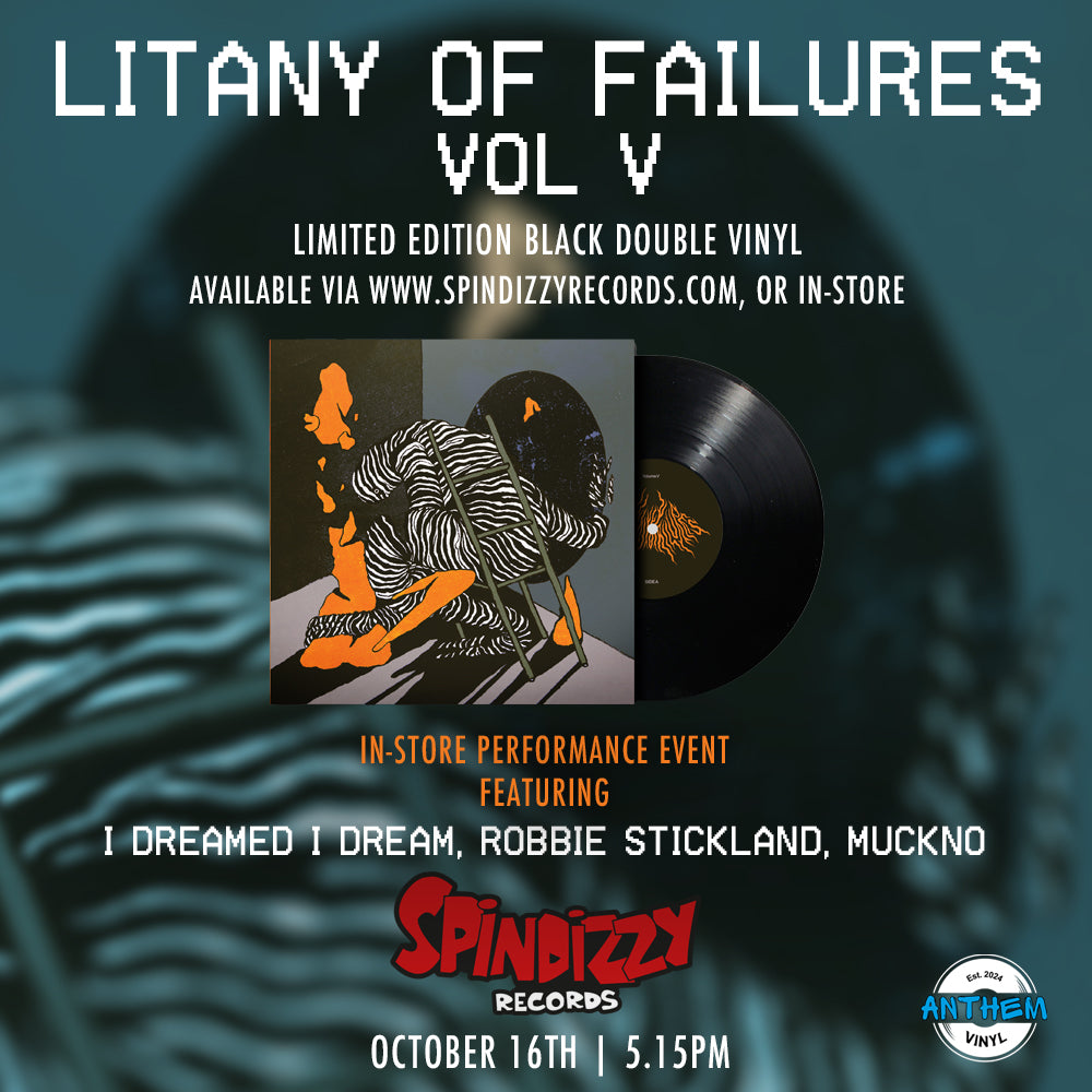 Add this listing to your cart to guarantee entry To celebrate the release of A LITANY OF FAILURES : VOL.5 compilation Spindizzy Records welcomes I DREAMED I DREAM, ROBBIE STRICKLAND & MUCKNO for an exclusive in-store...