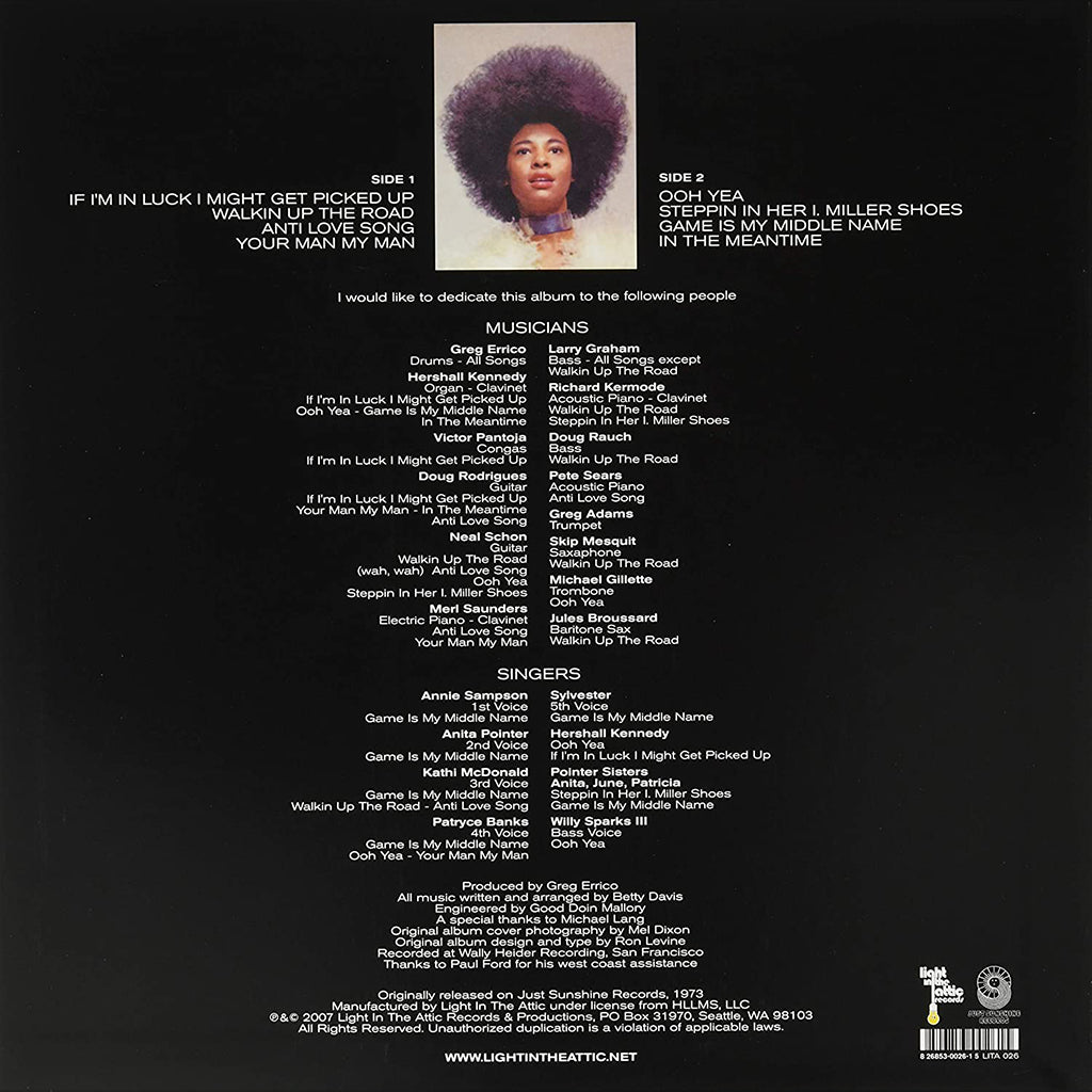 In 1973, Davis would finally kick off her cosmic career with an amazingly progressive hard funk and sweet soul self-titled debut. Davis showcased her fiercely unique talent and features such gems as “If I’m In Luck I Might Get Picked Up” and “Game Is My Middle Name.” The album Betty Davis was recorded with Sly & The Family Stone’s rhythm section, sharply produced by Sly Stone drummer Greg Errico, and featured backing vocals from Sylvester and the Pointer Sisters.