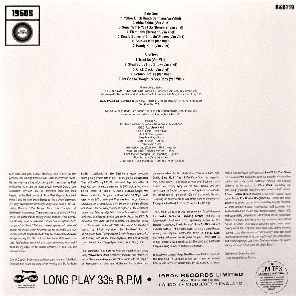 The second Peel session was to promote the Strictly Personal LP. Beatle Bones ‘n’ Smoking Stones features an idiosyncratic Beefheart vocal, apparently critical of the Beatles “Strawberry Feels Forever”. Safe As Milk was not included on the LP of the same name but has a more orthodox melody and rhythm. Beefheart’s hymn to Kandy Korn concludes with some intricate guitar interplay. Finally Trust Us is built around a hypnotic riff which the band and Beefheart keep returning to over its considerable length.