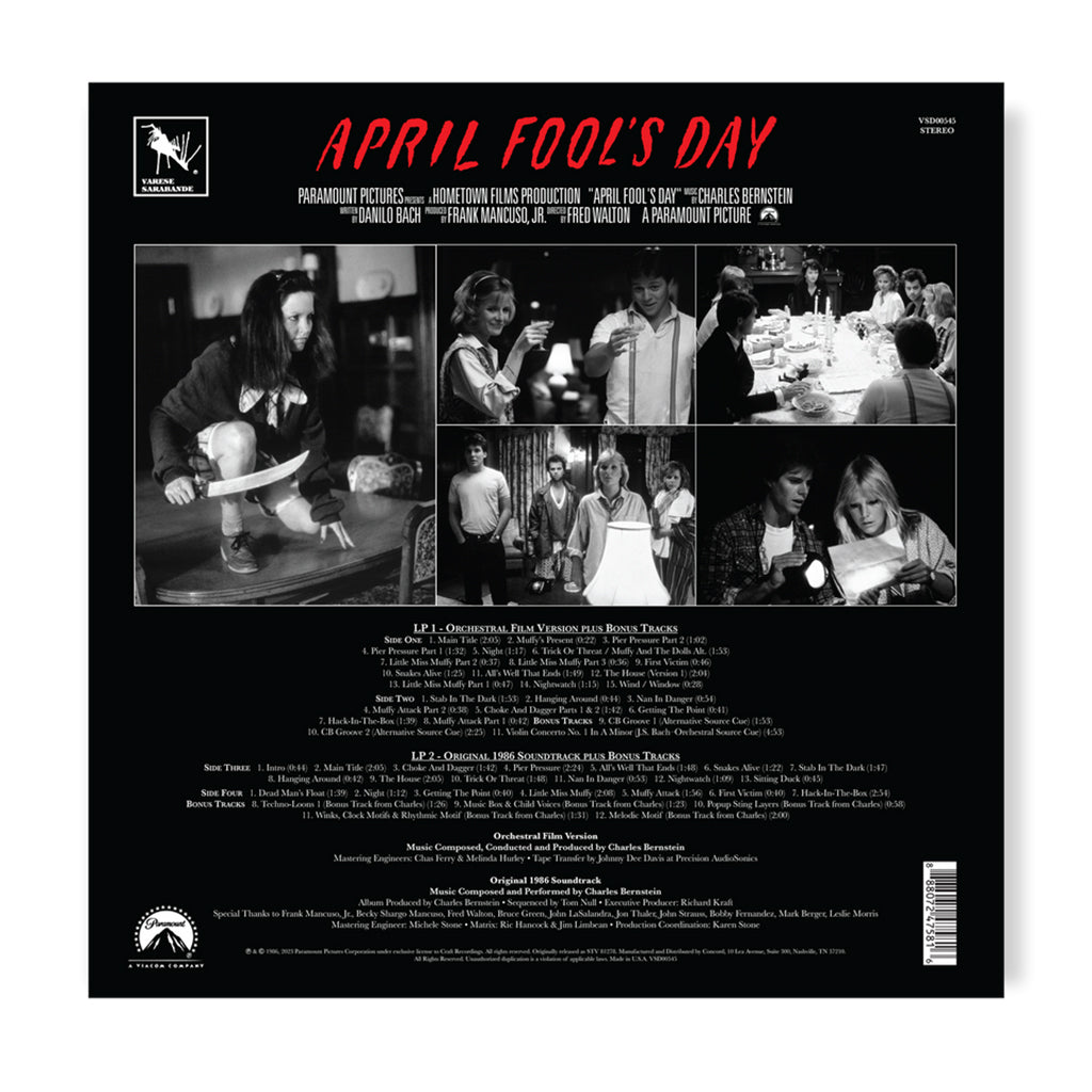 April Fool's Day is a 1986 American black comedy mystery slasher film that follows a group of college students vacationing during April Fool's Day weekend on an island estate, which is infiltrated by an unknown assailant. This Deluxe Edition release marks the first availability of the album on vinyl in 35 years, and features the first-ever release of the film’s original orchestral score, as well as five unreleased bonus tracks from the composer Charles Bernstein’s vaults.
