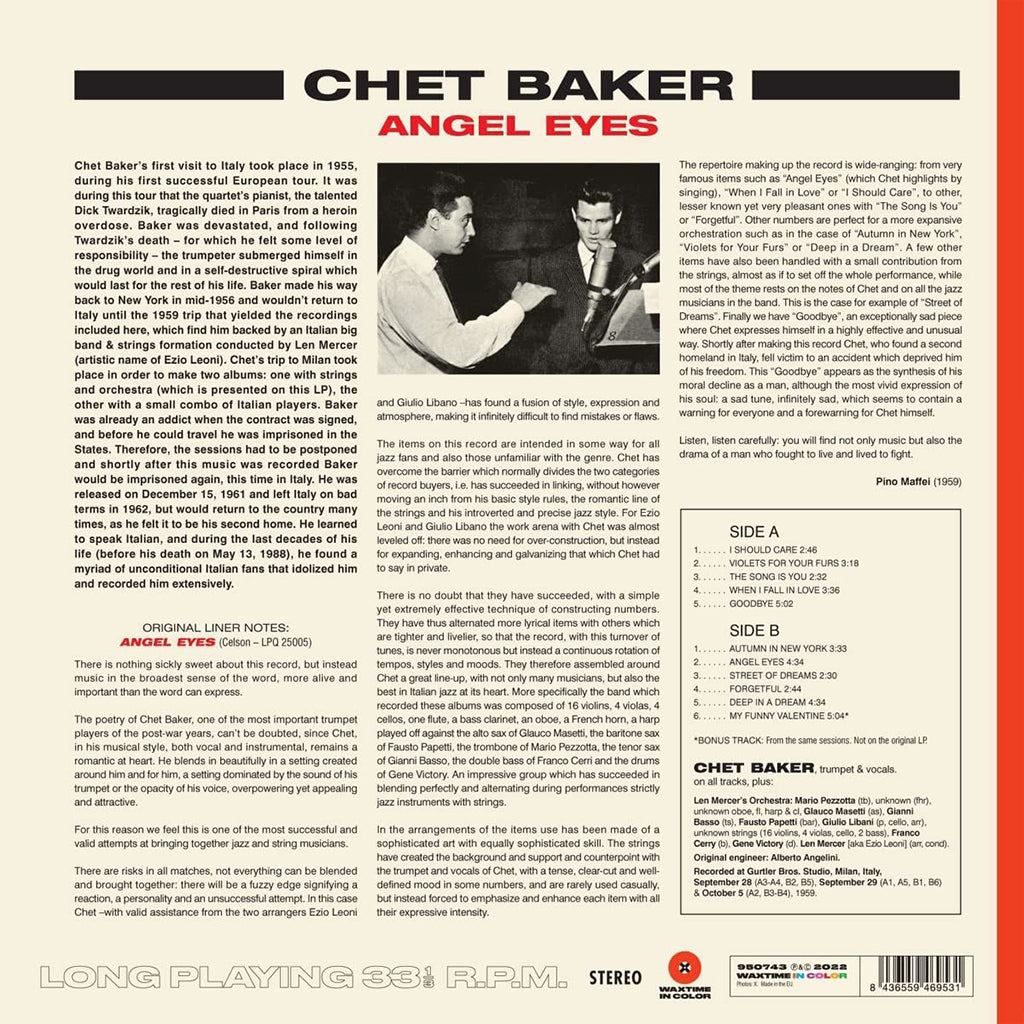 Originally issued in Italy as "Angel Eyes" and in the US as "Chet Baker with Fifty Italian Strings", this LP was made by Chet Baker in Milan during his second tour of Italy in 1959. Backed by a big band conducted by Len Mercer (the artistic name of the Milanese conductor Ezio Leoni) in a selection of well- known standards, including a new reading of the classic Baker hit, "My Funny Valentine."