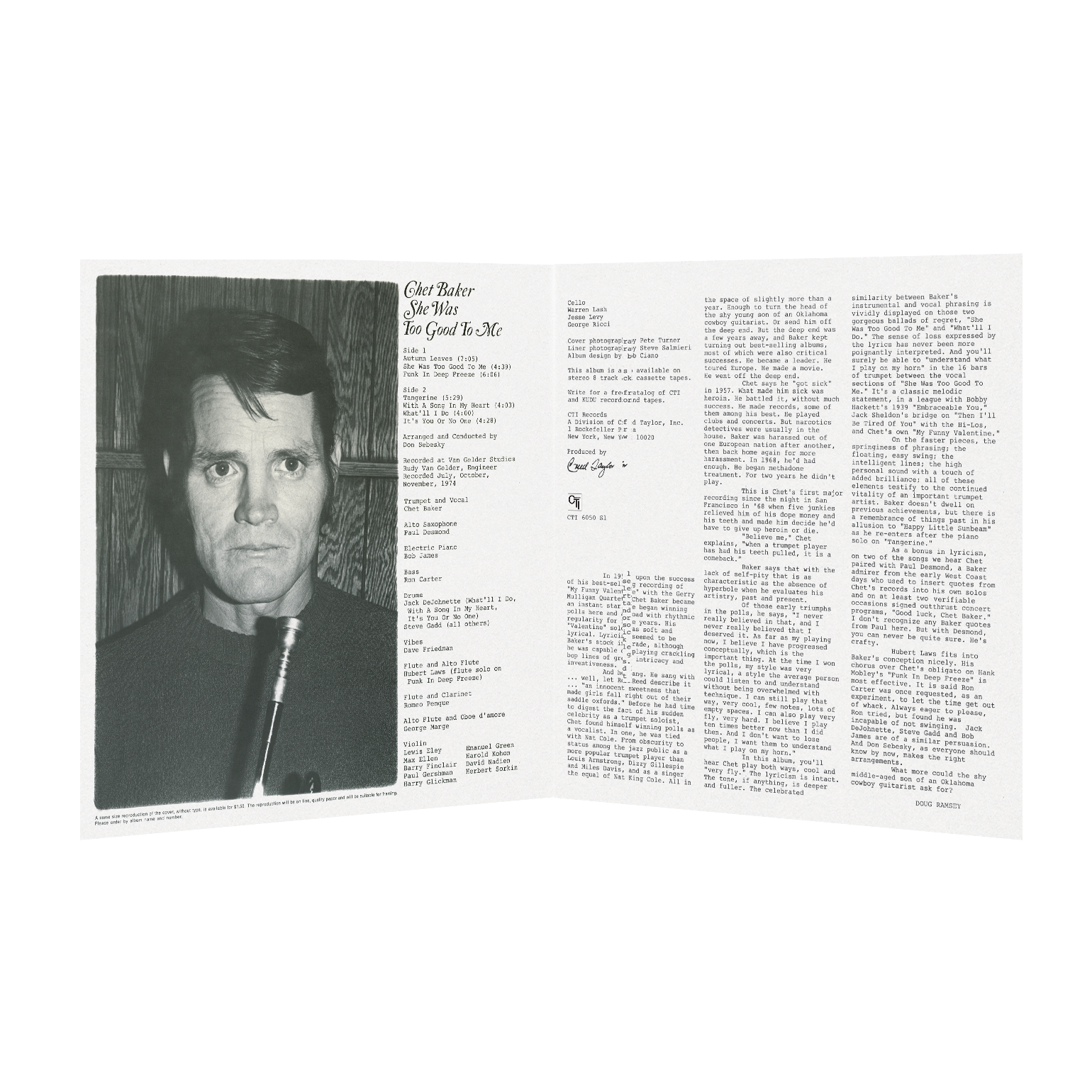 The immensely talented Chet Baker had a complex relationship with the music scene and after almost 20 years of performing he withdrew from the business. In 1973 he vowed to make a comeback, returning to the straight-ahead jazz that started his career. She Was Too Good To Me was released in 1974 by Creed Taylor’s legendary CTI label, by then home to Freddie Hubbard, Stanley Turrentine, Deodato and many others, and is considered Baker’s comeback album.