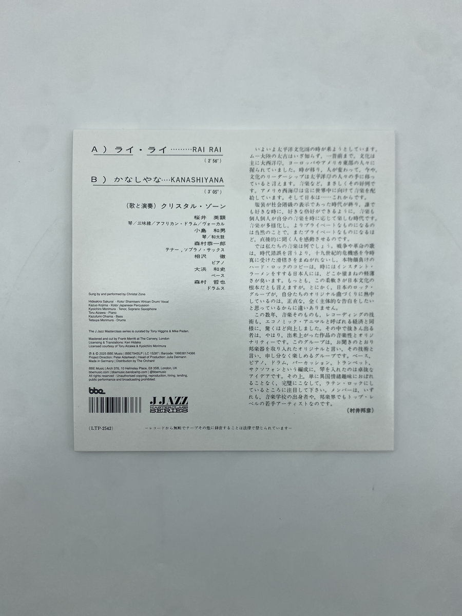 Several years before pianist Tohru Aizawa and brothers Tetsuya and Kyoichiro Morimura formed the now-celebrated Tohru Aizawa Quartet — whose 1975 private- press spiritual jazz LP Tachibana Vol 1 has become a cornerstone of the J Jazz canon and previously reissued by BBE — they were already venturing into bold, experimental territory. Their 1971 single Rai Rai, released as a promotional 7-inch on Liberty Records under the short-lived moniker Christal Zone was written and arranged by koto player and composer Hideakira Sakurai. An almost unclassifiable hybrid of jazz, Japanese folk, Algerian raï, and free improvisation. Sakurai’s visionary approach dominates the track, blending traditional Japanese instrumentation with a dense polyrhythmic groove that evokes not only avant-garde jazz but also the raw street energy of Algerian raï — celebratory, unfiltered, and joyfully unrestrained. The story behind the recording of Rai Rai is as spontaneous as the music itself. While casually rehearsing at Sakurai’s villa, the group was overheard by producer Kunihiko Murai, who was so stunned by what he heard that he arranged a studio session for them the very next day.