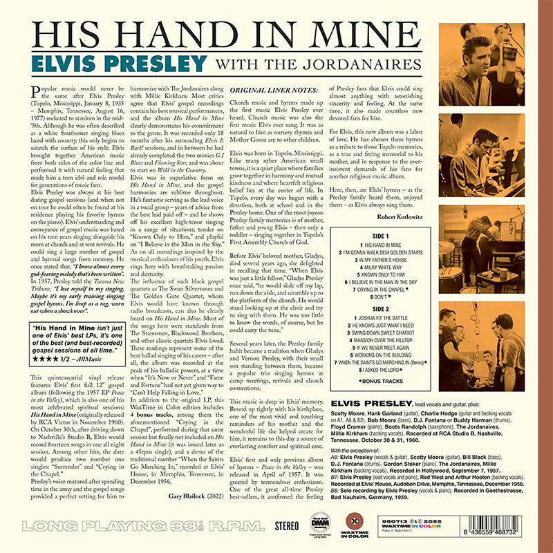 180 gram reissue of Presley's first full gospel album, originally released in 1960. Harmonising with the Jordanaires, here gospel sounds like second nature to the King. This is the full album with 4 bonus tracks.
