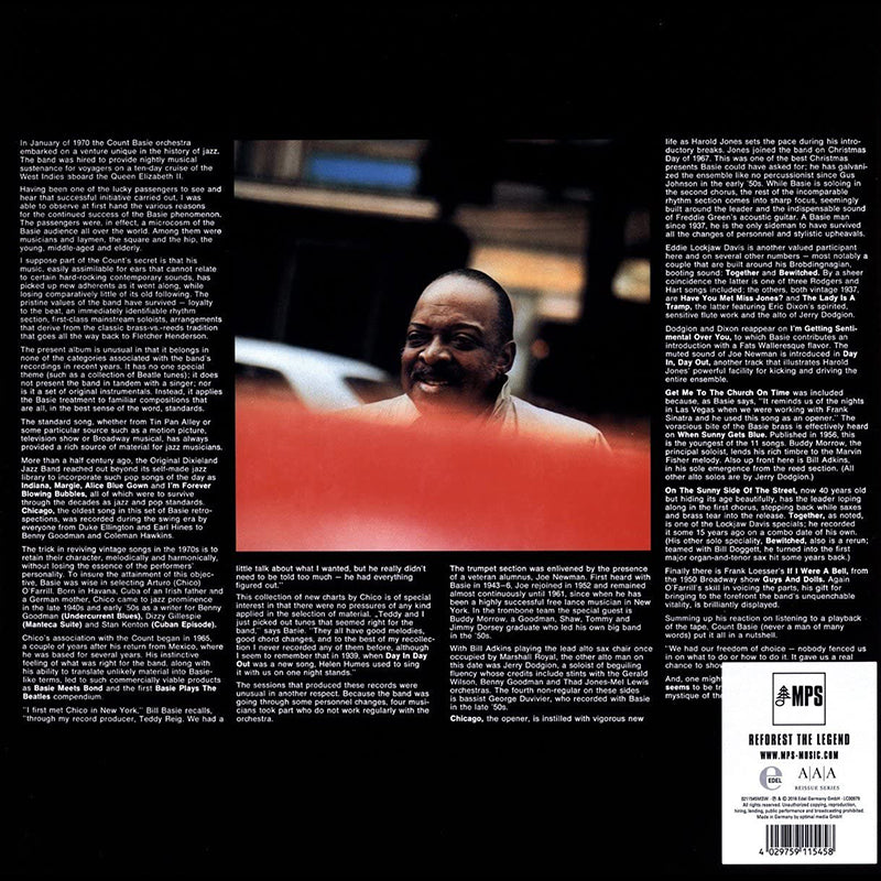 The Count's new drummer Harold Jones propels Fred Fisher's "Chicago" with a tremendous drive. The Rogers and Hart classic "Have You Met Miss Jones" features beguilingly dense deep- register horn lines and an almost languorous piano, and Eric Dixon's tasty flute solo spices up "The Lady Is A Tramp". With its smoky sophistication, Eddie Lockjaw Davis' Tenor dominates "Bewitched", whereas guest trumpeter Joe Newman's muted tongue- in- cheek solo highlights "Day In Day Out". Of course, Basie himself also steps forward: for instance, on the Fats Waller- like intro to "I'm Getting Sentimental Over You", and with the playful grace notes on "If I Were A Bell"." Reminiscent of the Las Vegas shows the band performed with Frank Sinatra, "Get Me To The Church On Time" is also a masterful dialogue between the horn sections.
