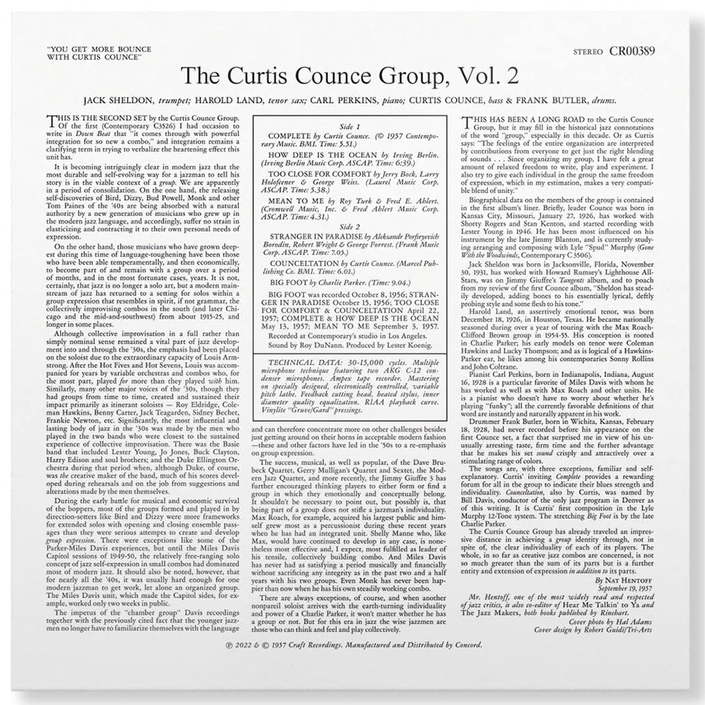 Acoustic Sounds celebrates Contemporary Records with this reissue of Curtis Counce's 1957 album 'You Get More Bounce With Curtis Counce!'. Originally released in 1957 the album sees Counce (bass) alongside Jack Shelton (trumpet), Harold Land (tenor sax), Carl Perkins (piano) and Frank Butler (drums).