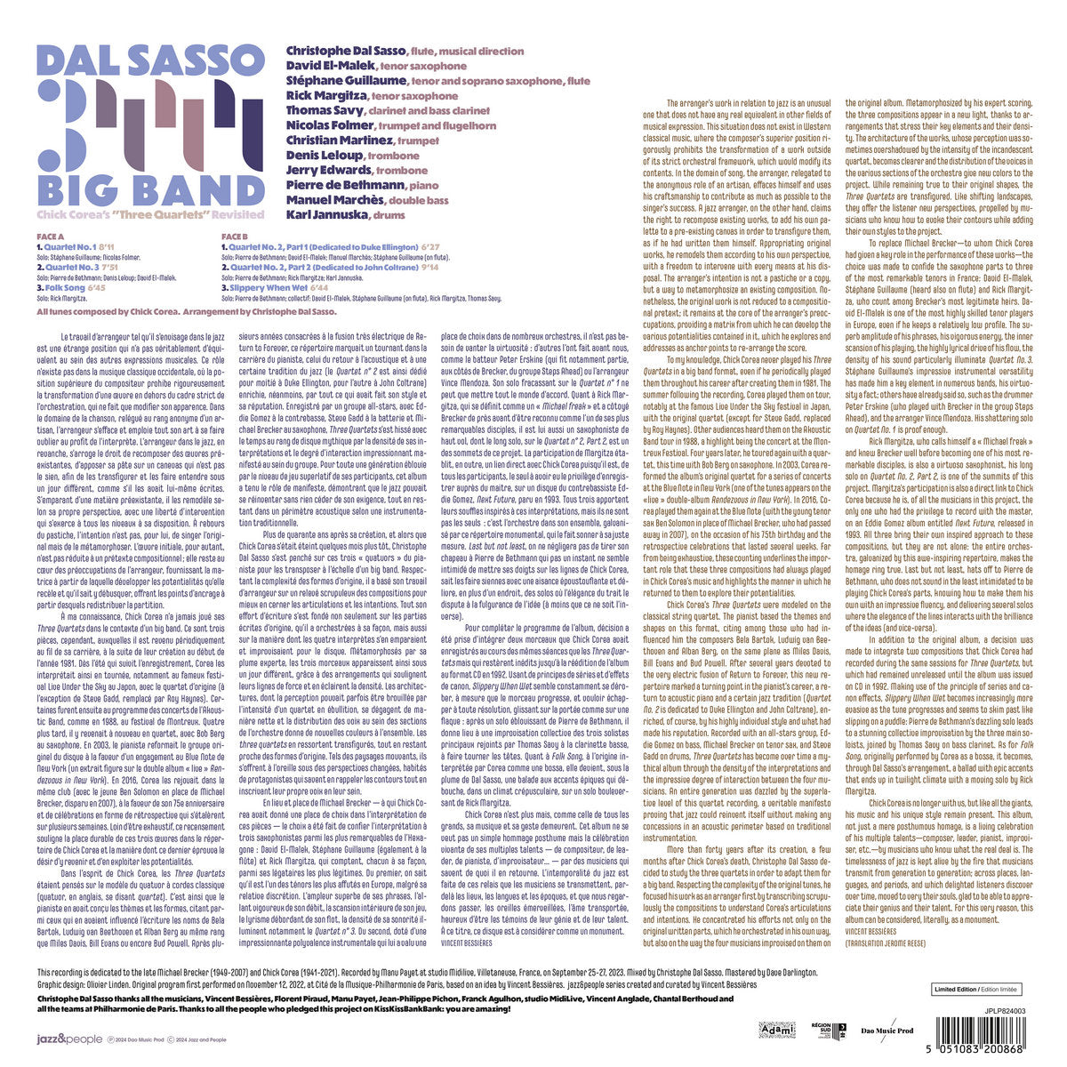 Dal Sasso strikes again. Following the big band arrangements of John Coltrane’s classics, ‘A Love Supreme’ and ‘Africa/Brass’, Christophe Dal Sasso tackles Chick Corea’s Three Quartets (1981). Under the expert guidance of the arranger, his big band - voted Group Of The Year by France’s Victoires du Jazz in 2020 - revisits the pianist’s legendary album, with on the front line, following the footsteps of the late Michael Brecker, three exceptional saxophonists who all owe a debt to him: David El-Malek, Stéphane Guillaume and Rick Margitza (who recorded with Chick Corea at an early stage of his career).