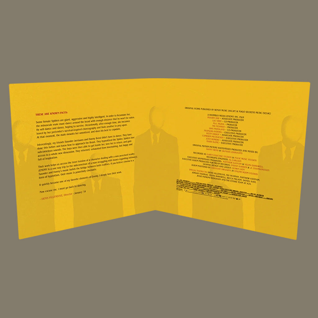 Enemy is available on vinyl for the first time. This is a limited edition of 500 individually numbered copies on translucent yellow coloured vinyl. The gatefold includes liner notes by director Denis Villeneuve.