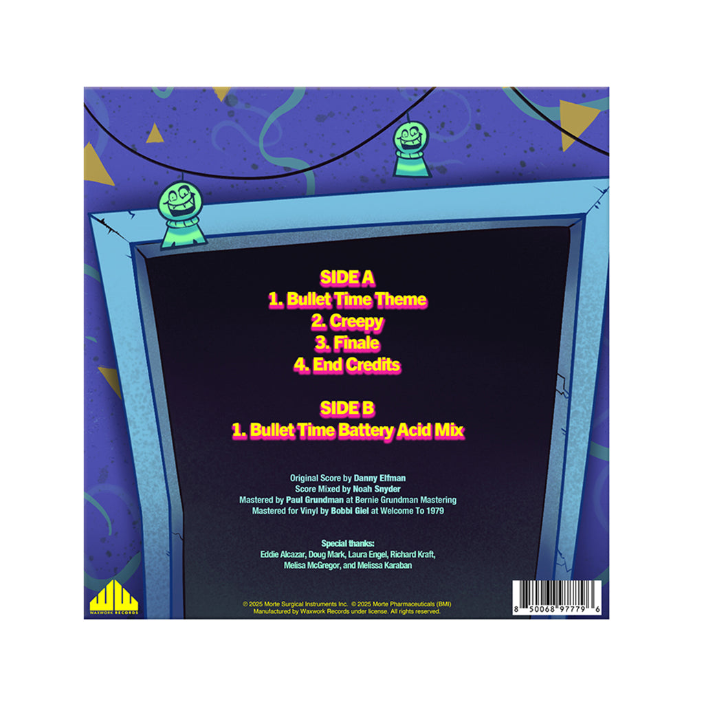 Waxwork Records is thrilled to release BULLET TIME Original Animated Picture Soundtrack by Danny Elfman as a deluxe 7" vinyl EP and also on cassette! Features include 90s inspired splatter coloured vinyl, an insert, and artwork by Kostas Firinidis and cassette artwork by Tristan Tait and Kostas Firinidis.