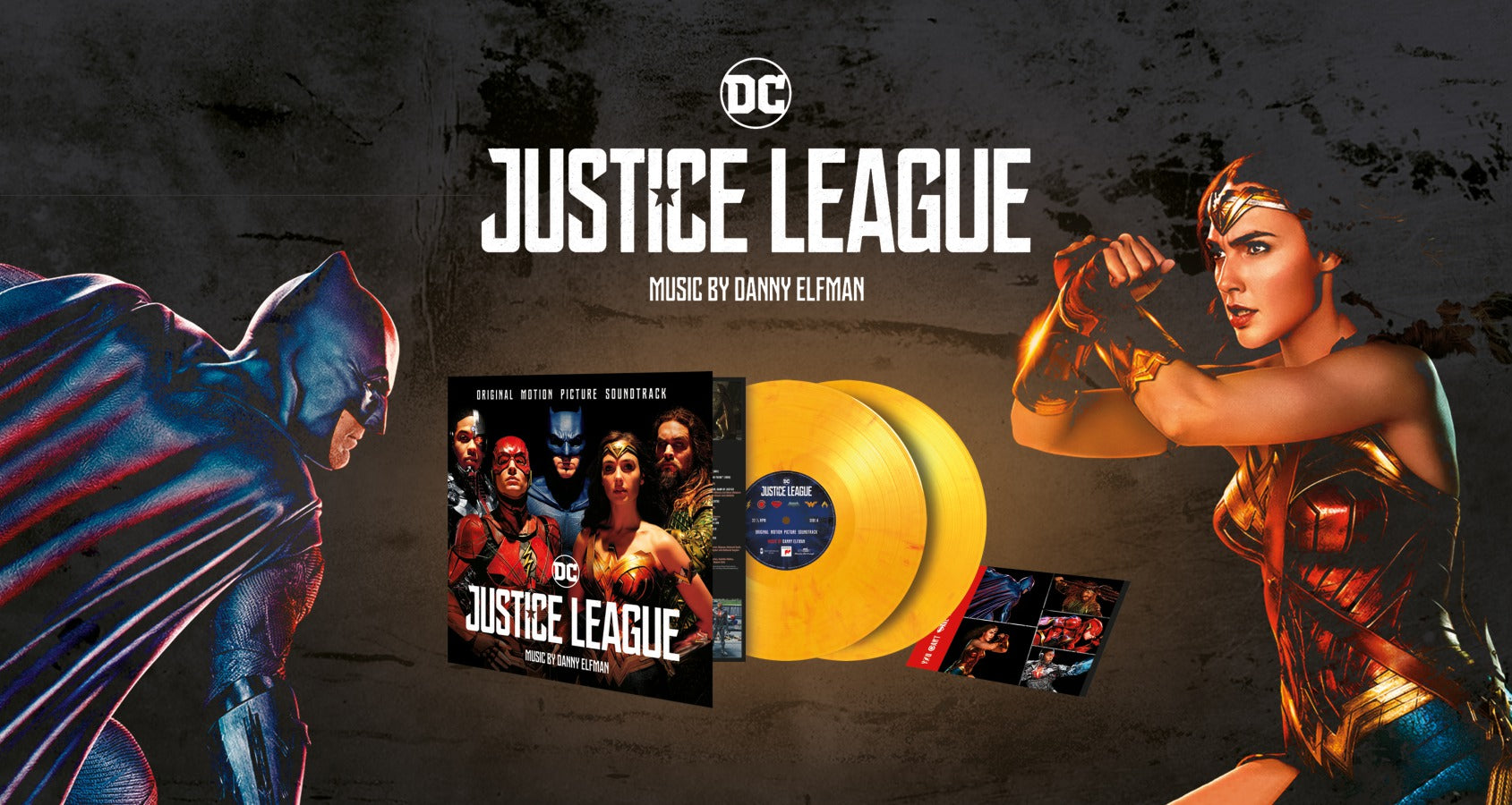 Justice League is available as a limited edition of 1000 individually numbered copies on flaming coloured vinyl. This 2LP includes a sticker sheet of the different Justice League characters and is housed in a deluxe gatefold sleeve.