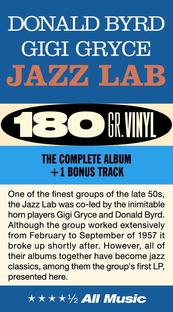 "Gigi Gryce and Donald Byrd's innovative, but unfortunately short-lived Jazz Lab Quintet recorded several sides during 1957, seven of which were released on this excellent LP. Jazz Lab makes for an excellent introduction to the hard bop catalogue." - 4.5 STARS AllMusic (Stephen Cook)