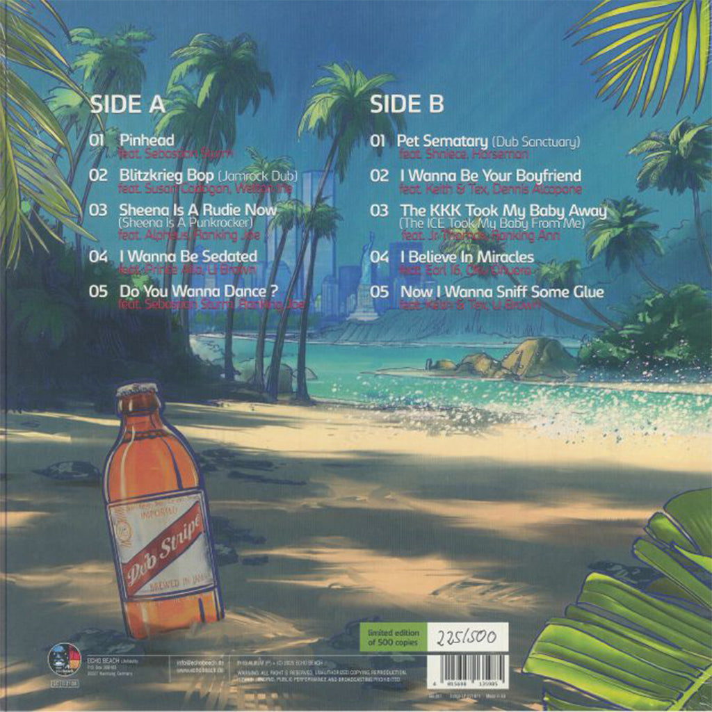 The label Echo Beach, a bit of a specialist for missions such as these with a string of releases including “Bad Brains in Dub”, “Dubby Stardust”, got together with André Meyer (production, bass) and Manougazou (production, guitar). Both were part of the 2008 Echo Beach New Wave/Dub project DubXanne and were involved in the production and subsequent live shows. Also back in the team is keyboarder and DubXanne mastermind Guido Craveiro, who plays Hammond organ and piano on half of the tracks. The other two additions to the core team are singer and all-round instrumentalist Sebastian Sturm and drummer Raul Pfeffer. Together they homed in on the 11 most iconic Ramones three-minute-singalongs, including "Blitzkrieg Bop", "I Wanna Be Sedated", "Pet Sematary" and "Rock'n'Roll Highschool", and treated them to a reggae make-over.