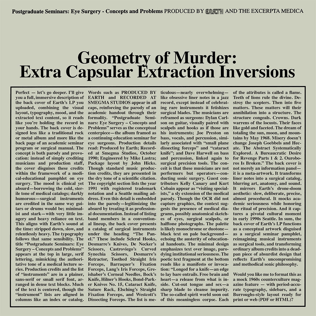 ‘Extra Capsular Extraction’ was the first music Dylan made with Earth and his first time in a recording studio, which he recalls at the time as being “terribly exciting”. It also marked the first time collaborating with others and seeing it reified into a tangible object or product, a spirit that Dylan has carried through to the present. The original album is a document of a specific period and Dylan’s creative development. These inversions of Extra Capsular Extraction are, to quote Dylan, “an exciting way to reintegrate them into the present time and with my more expanded conceptions of musical endeavours”.