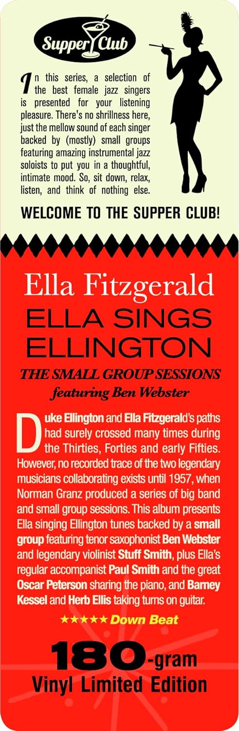 Duke Ellington and Ella Fitzgerald's paths had surely crossed many times during the Thirties, Forties, and early Fifties. However, no recorded trace of the two legendary musicians collaborating exists until 1957, when Norman Granz produced a series of big band and small group sessions. This album presents Ella singing Ellington tunes backed by a small group featuring tenor saxophonist Ben Webster and legendary violinist Stuff Smith, plus Ella's regular accompanist Paul Smith and the great Oscar Peterson sharing the piano, and Barney Kessel and Herb Ellis taking turns on guitar.