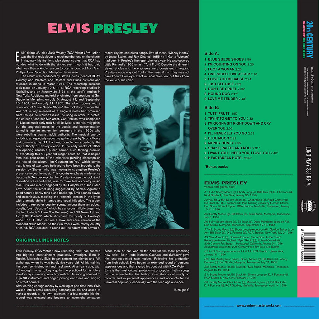 In a time when rock & roll hits were released on 45rpm discs, Elvis' debut LP, titled Elvis Presley, was the first rock album to reach number one on the charts, and RCA's first million dollar-earning pop album. It contained such classics as "Blue Suede Shoes", 'Tutti Frutti', and Elvis' version of 'Blue Moon'. The original album is issued here in its entirety with the addition of six bonus tracks.