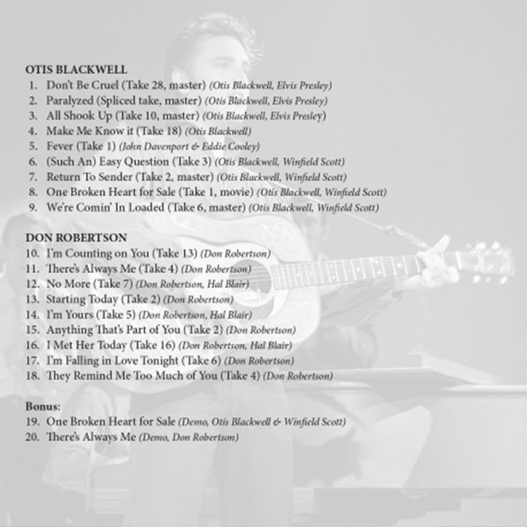 This album brings together two singer-songwriters, both pianists, who made a remarkable contribution to the work and career of the King. While Otis Blackwell excelled in rock ‘n’ roll, of which he was one of the great craftsmen (providing Elvis with no less than three number 1 hits), Don Robertson, on the other hand, was a master in the art of the ballad (several of his compositions would appear on the B-sides of successful singles). Two exceptional artists who deserve a place in the Music Pantheon!