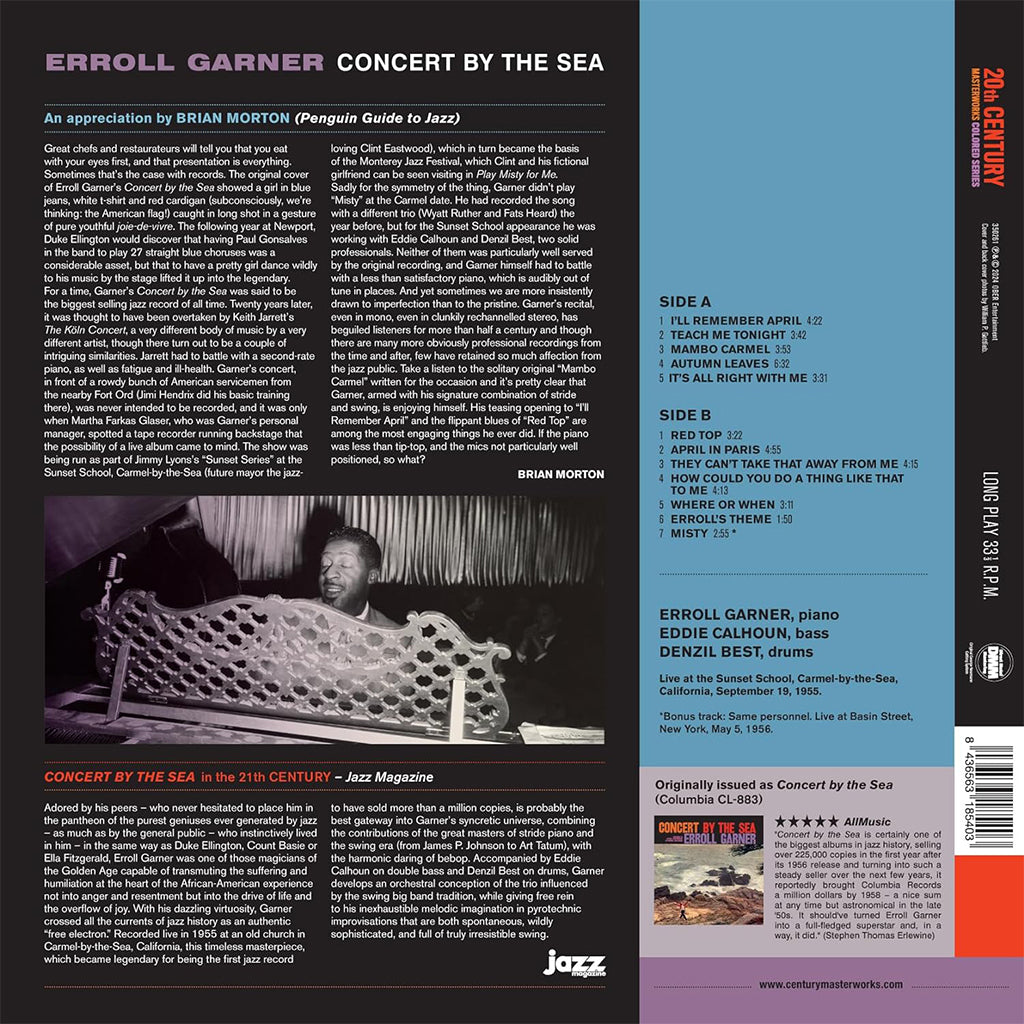 The complete original Erroll Garner album Concert by the Sea (Columbia CL-883), which marked the pianist's best-selling record ever. There was actually no official plan to record the concert, and the release came about because Garner's personal manager, Martha Glaser, spotted that a tape recorder was running backstage and decided to use the tape, originally intended for the Armed Forces Radio Network.