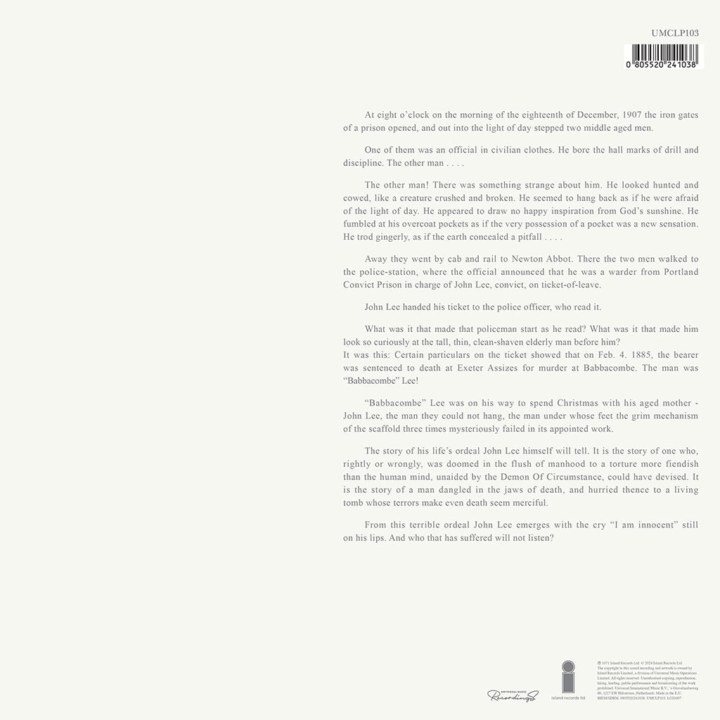 Released at the end of 1971 with ephemera from the day telling the story, 'Babbacombe' Lee had episodes listed rather than tracks. It contained the most original material of a Fairport album to date, and was seen as taking folk-rock a huge step forward. Within weeks of the album's release both Dave Mattacks and Simon Nicol left the group, leaving Swarbrick and bassist Dave Pegg to lead Fairport on through their next chapter. Today, 'Babbacombe' Lee is one of the group's most enduring albums.
