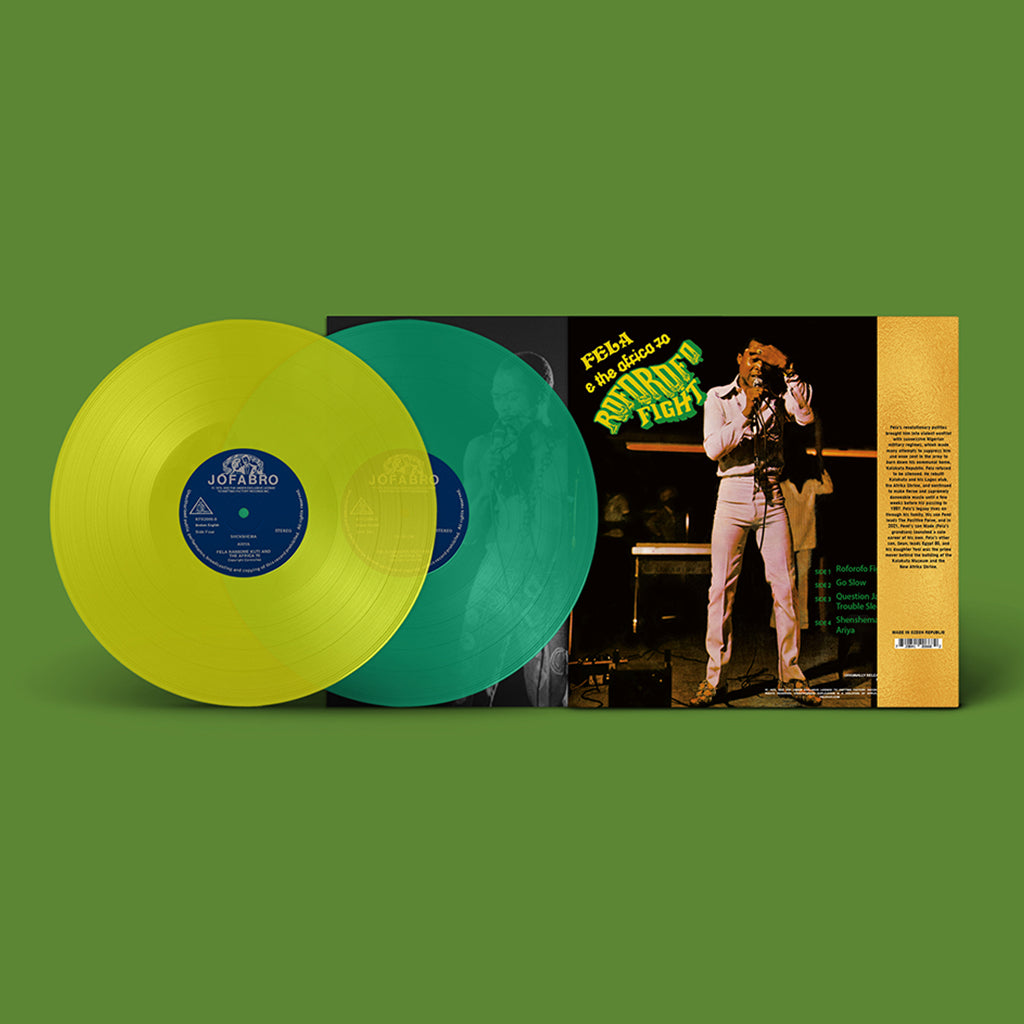 The 50th-anniversary reissue of Roforofo Fight is pressed on double yellow & green vinyl. Side D features singles "Shenshema" and "Ariya" on vinyl for the first time. The two tracks were originally released as a 7" single in 1972 and later featured in the CD reissue of "Roforofo Fight / The Fela Singles".