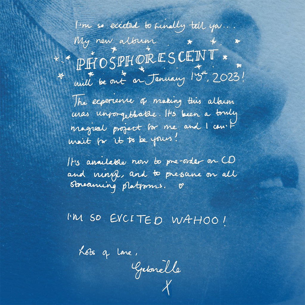 ‘Phosphorescent’ is not a lockdown album, but it is the product of the solitude and strangeness that Gabrielle, like so many of us, experienced throughout that time. She says, “I was writing again for fun. I was purely expressing myself with no brief. No-one was telling me what to do, in fact I didn’t have to do anything. At the start there was no goal, but as the songs started emerging I could see that they were about things I’d never really processed until that time".