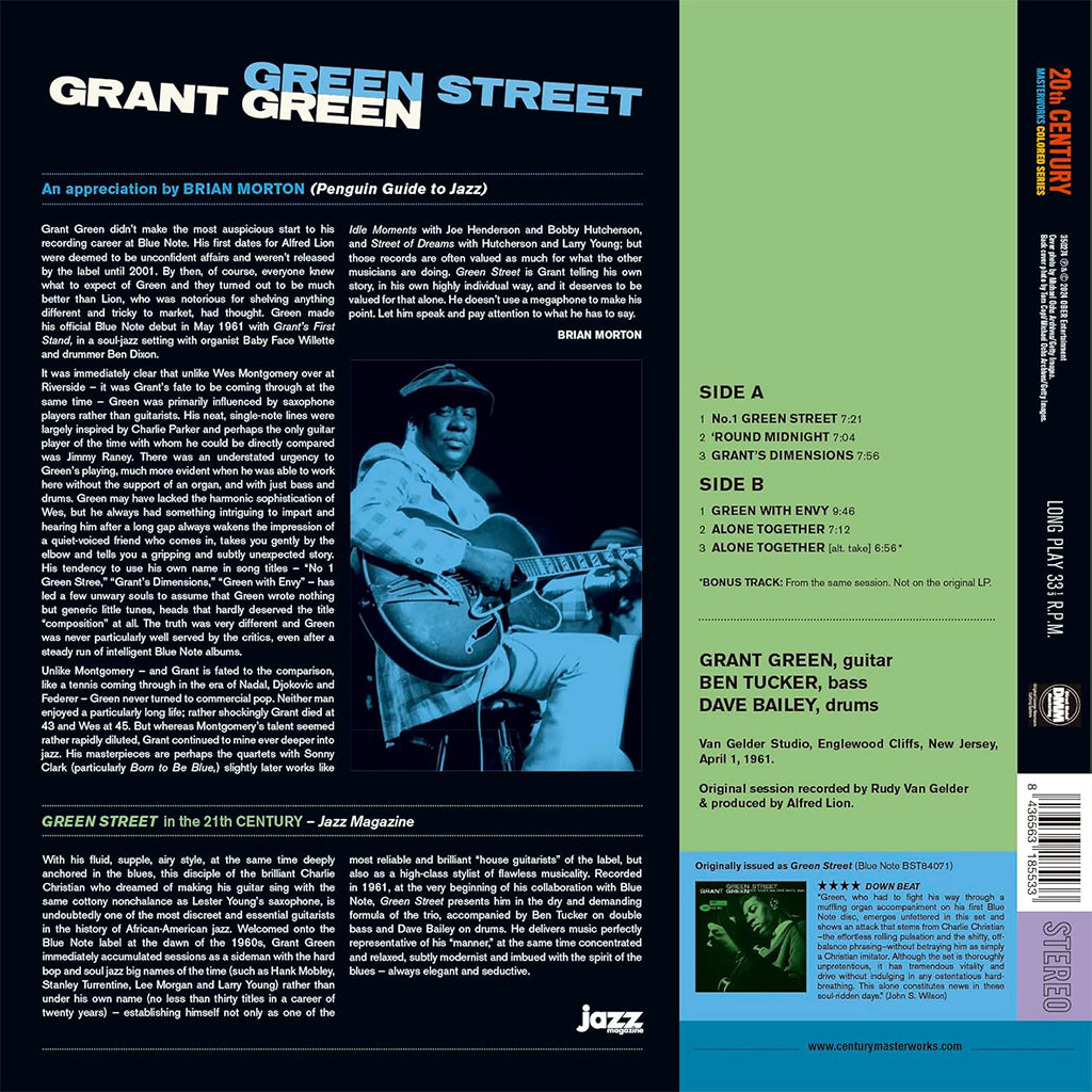 "If this is not a definitive jazz guitar trio, they have not yet been born, and 'Green Street’ stands as one of Grant Green's best recordings of many he produced in the ten prolifc years he was with the Blue Note label." - **** Michael G. Nastos, AllMusic