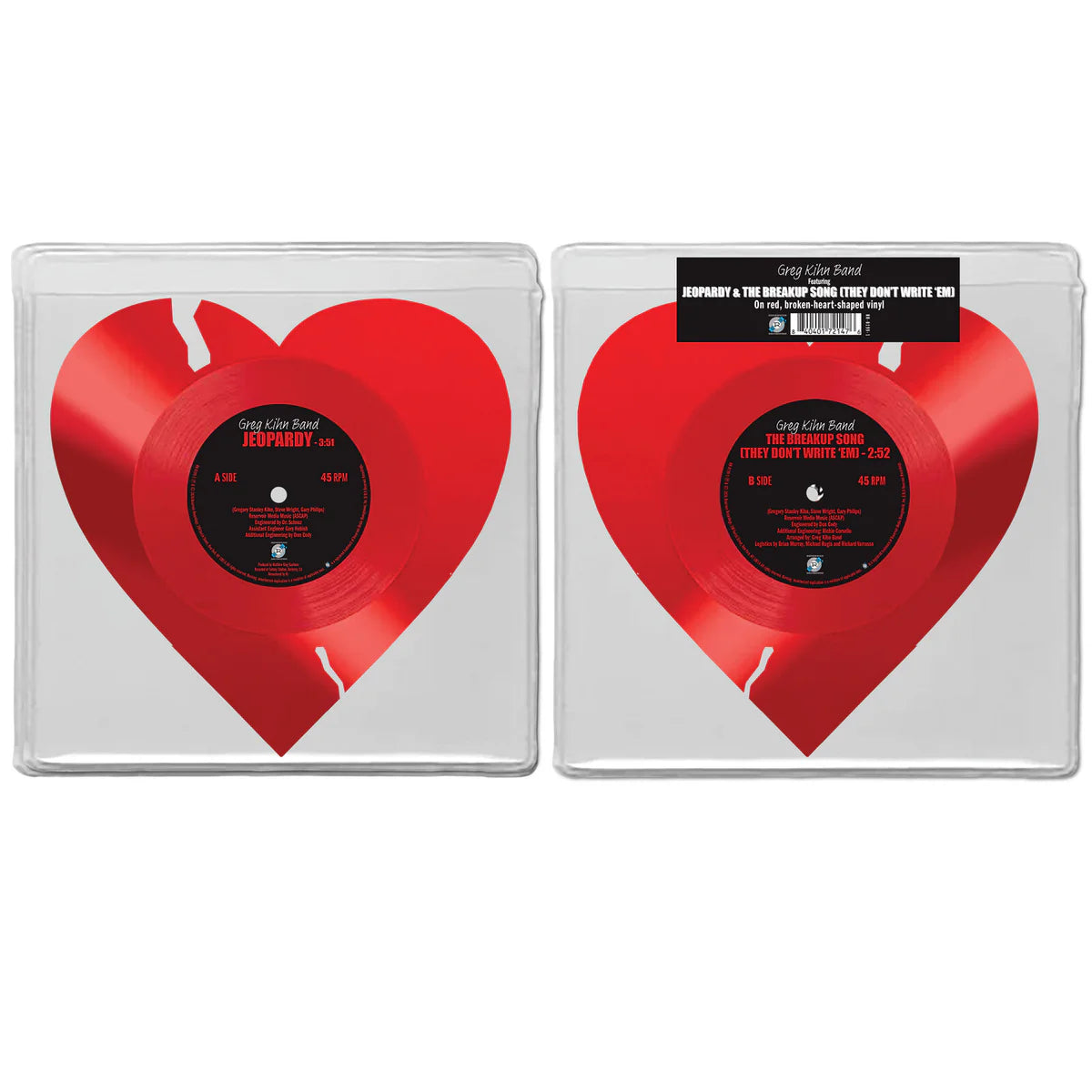 Greg Kihn Band's hit "Jeopardy" is the first single off their 1983 album Kihnspiracy. The track became the band's biggest hit, reaching No. 2 on the Billboard Hot 100, and its success was boosted by a memorable, campy MTV video that cemented its place in pop culture. Pressed on broken-heart-shaped red vinyl, this 7" features "The Breakup Song (They Don't Write 'Em)" - the band's second highest-charting single.