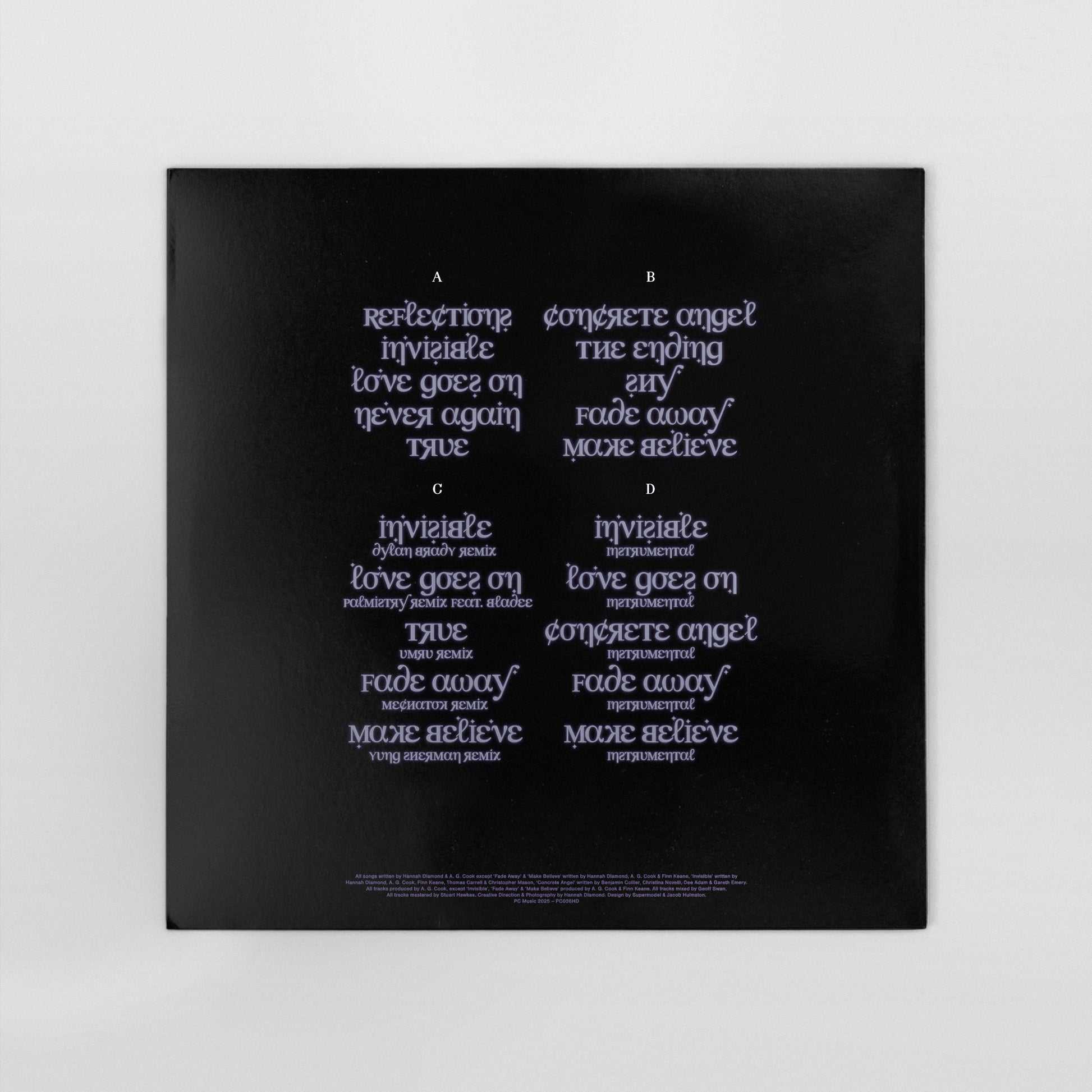 Hannah Diamond’s debut album Reflections expanded to include Reflections Remixes and selected Reflections Instrumentals across two LPs. This upscaled edition is pressed on Milky Way Clear Glitter vinyl, in a gatefold sleeve featuring the Remixes Star artwork, and premium board inner sleeves, enhanced with metallic lavender HD monograms. It also includes a high-gloss poster insert of the original Moon artwork and lyric sheet. No secret track.
