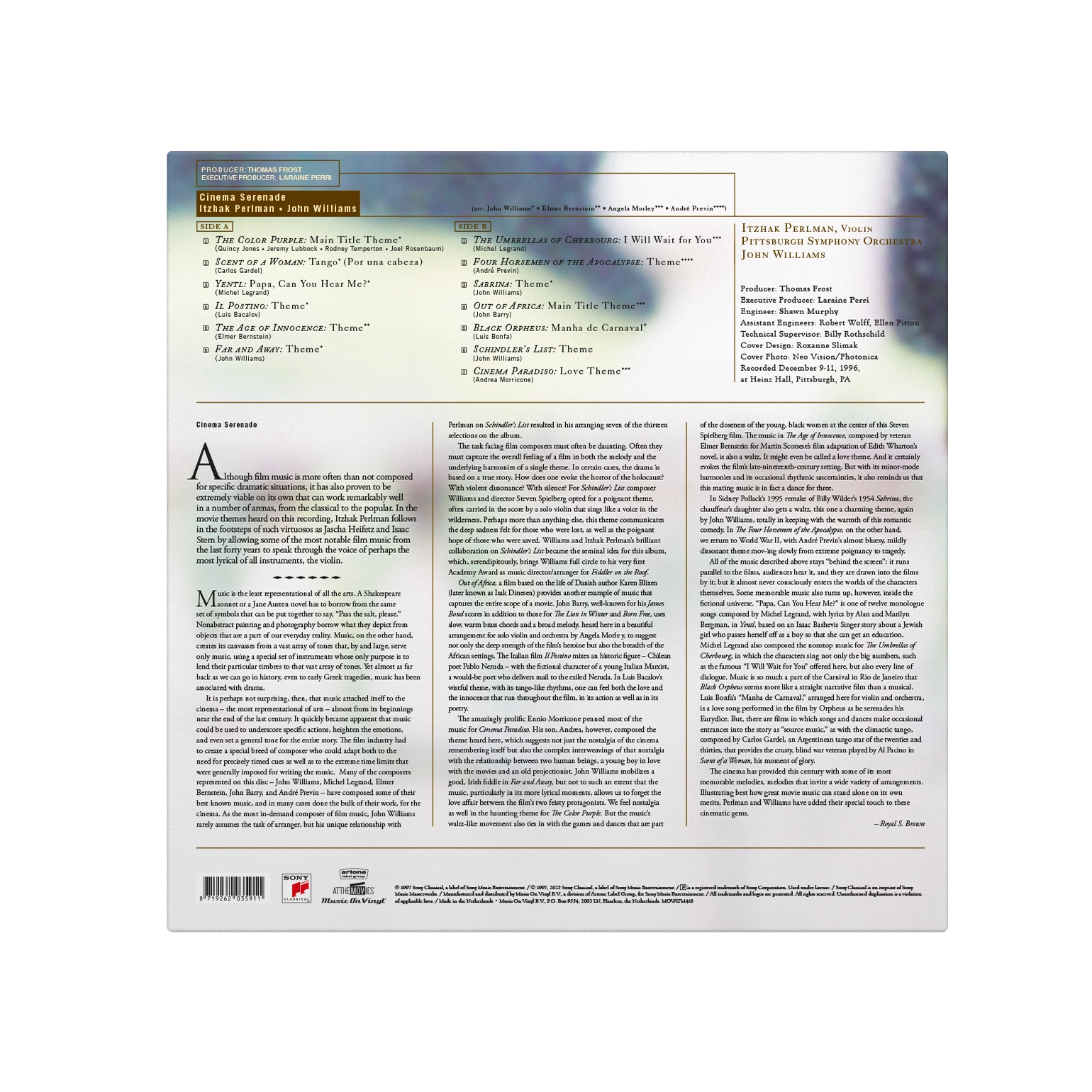 Cinema Serenade is an album by John Williams and Itzhak Perlman, featuring orchestral performances of famous and notable film themes, with Perlman's violin at the forefront. The album presents new arrangements of scores from composers that made a lasting impact on the world of cinema, with a special touch by Williams and Perlman on these cinematic gems. Amongst others, it features work by Michel Legrand, Elmer Bernstein, John Barry, André Previn and John Williams himself. All the work on this album is conducted by Williams and performed by the Pittsburgh Symphony Orchestra. It also features exclusive liner notes from well-known film critic, musicologist and professor Royal S. Brown, presented on the back of the sleeve. Cinema Serenade provides a collection of unique film arrangements, perfect for the film music fan.