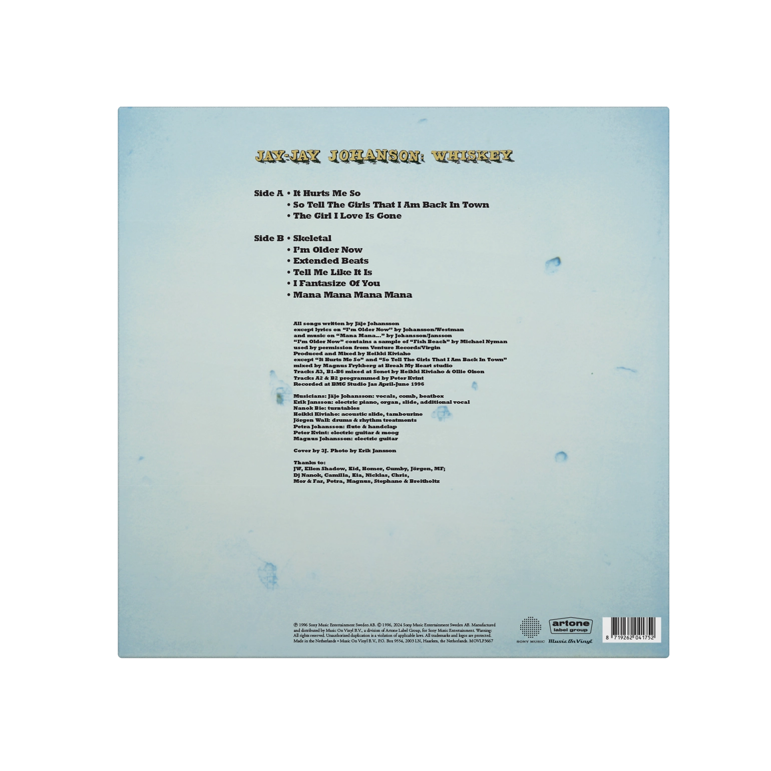 Whiskey is the 1996 debut album by Jay-Jay Johanson. An exciting mix of trip hop, nu jazz and drum 'n' bass; all with the amazing vocals of Jay-Jay himself. Key tracks like "So Tell the Girls That I Am Back in Town" and "It Hurts Me So" showcase his ability to fuse smooth, lounge-like vocals with electronic beats and lush instrumentation.