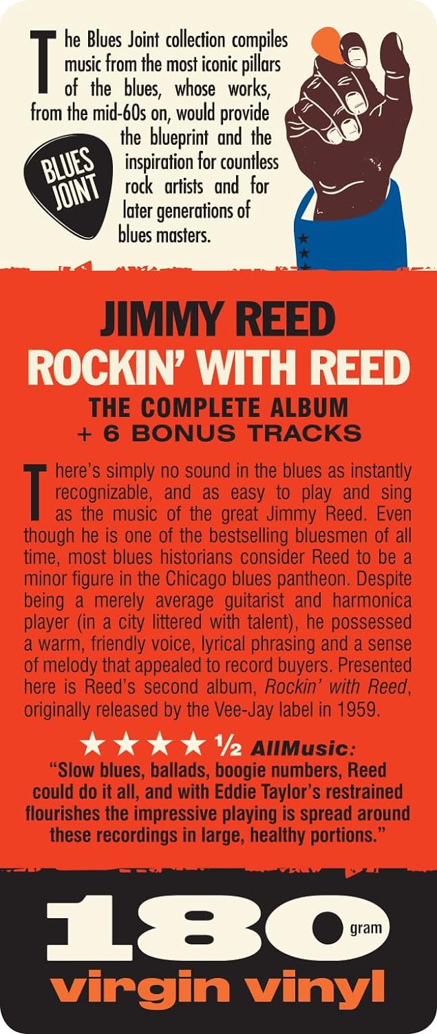 There is simply no sound in the blues as instantly recognizable, and as easy to play and sing as the music of the great Jimmy Reed. Even though he is one of the bestselling bluesmen of all time, most blues historians consider Reed to be a minor figure in the Chicago blues pantheon. Despite being a merely average guitarist and harmonica player (in a city littered with talent), he possessed a warm, friendly voice, lyrical phrasing and a sense of melody that appealed to record buyers. Presented here is Reed's second album, Rockin' with Reed, originally released by the Vee-Jay label in 1959.