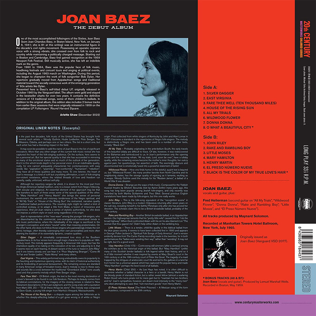 One of the most accomplished folksingers of the Sixties, Joan Baez was an instrumental figure in the decade's civil rights movement. Possessing an operatic soprano voice with a strong vibrato, she crossed over from folk to rock and country while maintaining a politically charged message. Presented here is Baez's self-titled debut LP, originally released in October 1960 by the Vanguard label. The album went gold and stayed in the bestseller charts for over two years. It contains the definitive versions of 13 traditional songs, some of them children's ballads.