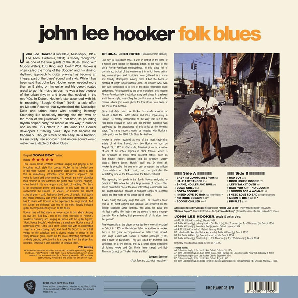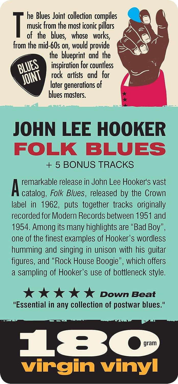 A remarkable release in John Lee Hooker's vast catalogue, Folk Blues, released by the Crown label in 1962, puts together tracks originally recorded for Modern Records between 1951 and 1954. Among its many highlights are Bad Boy, one of the finest examples of Hooker's wordless humming and singing in unison with his guitar fgures, and Rock House Boogie, which offers a sampling of Hooker's use of bottleneck style.
