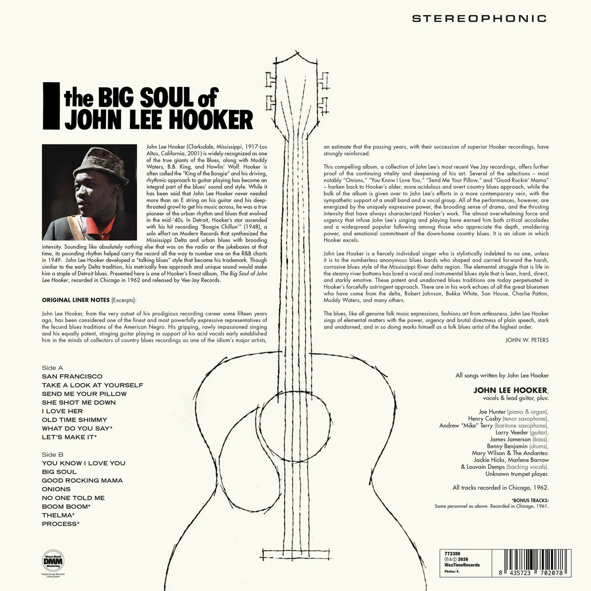 John Lee Hooker is widely recognised as one of the true giants of the blues, along with Muddy Waters, B.B. King, and Howlin' Wolf. Hooker is often called the "King of the Boogie" and his driving, rhythmic approach to guitar playing has become an integral part of the blues' sound and style that perpetuated the UK's rhythm and blues scene of the '60s. Presented here is one of John Lee Hooker's finest album, The Big Soul of John Lee Hooker, recorded in Chicago in 1962.