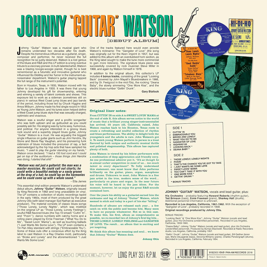 This essential vinyl edition presents Watson’s underrated debut album, Johnny “Guitar” Watson, originally issued by King Records in 1962 and long unavailable on vinyl. The LP contains a collection of studio recordings taped in the early 1960s, most of them produced by the great Johnny Otis (with label manager Syd Nathan as executive producer). The material consists of classic blues songs (“Those Lonely, Lonely Nights”, which was mistitled on the original LP as “Those Lonely, Lonely Feelings”); soulful R&B flavoured blues (the Top-10 smash “Cuttin’ In”, and “Posin’”); dance numbers with catchy horns and a rolling piano played by Ernie Freeman (“What You Do to Me”, “Sweet Lovin’ Mama”), as well as touching ballads (“I Just Wants Me Some Love”). The LP even contains a Tin Pan Alley standard with strings (“Embraceable You”). Some of these cuts offer a conscious effort by the King label to cast Watson in a Ray Charles mold, particularly on “Broke and Lonely” and the aforementioned “I Just Wants Me Some Love”.