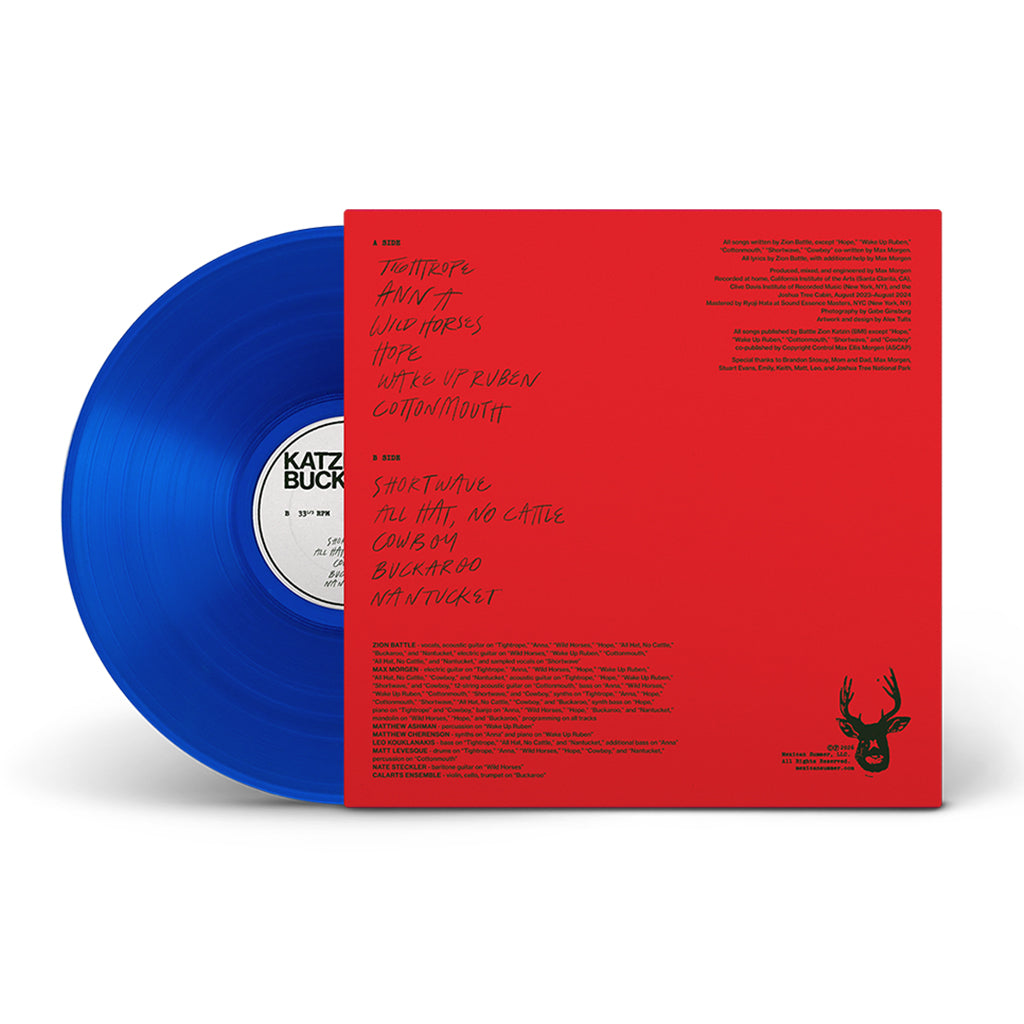 Buckaroo, the debut album from New York songwriter Katzin, projects symbols of the mythologized American West -- cowboys, horses, vast deserts, rolling plains, ancient rock formations -- onto the leap from adolescence to adulthood in all its unsteady shine. Zion Battle broke ground on the album the summer after he graduated from high school. Together with collaborator and producer Max Morgen, he drove to Joshua Tree for a week of intensive recording. "By isolating ourselves, we were able to capture this raw creative energy,” Battle says. “It feels like we made a love letter to our childhoods." Surging with rolling drums, filigreed synthesizers, and guitars that flip from a whisper to a thunder roll on a dime, Buckaroo renders the beauty of North America through a deceptively nonchalant electroacoustic collage. “One of our main goals was to make the album sound like the desert,” says Battle. Elegiac and smoldering with hope, Buckaroo sticks with you: a perfect snapshot of a vivid time. "It’s a recording of a moment in adolescence as much as it’s a musical recording," says Battle. "I really think in 30 years I’ll look back on it and maybe cry."