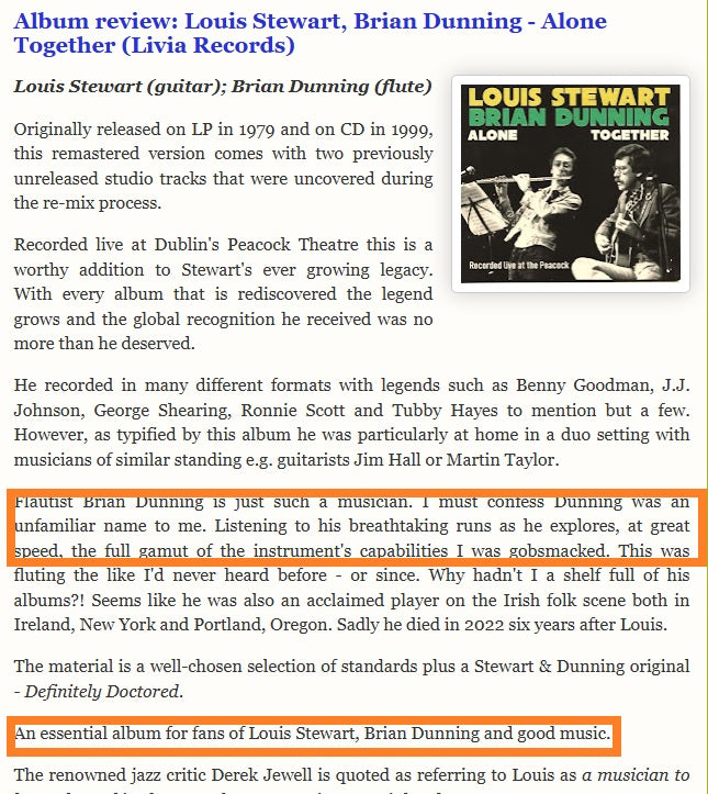 " I must confess Dunning was an unfamiliar name to me. Listening to his breathtaking runs as he explores, at great speed, the full gamut of the instrument's capabilities I was gobsmacked." ..An essential album for fans of Louis Stewart, Brian Dunning and good music" - BeBopSpokenHere