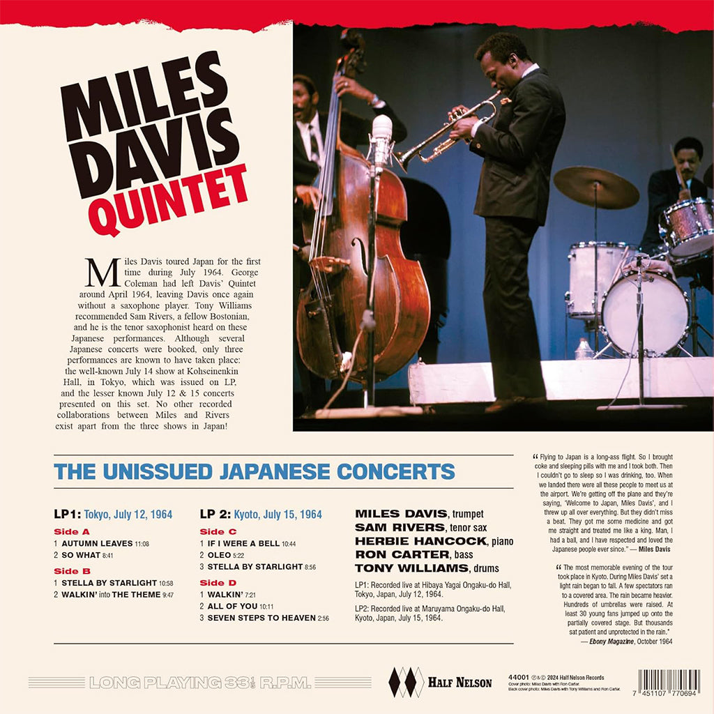 Miles Davis toured Japan for the first time during July 1964. George Coleman had left Davis’ Quintet around April 1964, leaving Davis once again without a saxophone player. Tony Williams recommended Sam Rivers, a fellow Bostonian, and he is the tenor saxophonist heard on these Japanese performances. Although several Japanese concerts were booked, only three performances are known to have taken place: the well-known July 14 show at Kohseinenkin Hall, in Tokyo, which was issued on LP, and the lesser known July 12 & 15 concerts presented on this set. No other recorded collaborations between Miles and Rivers exist apart from the three shows in Japan!