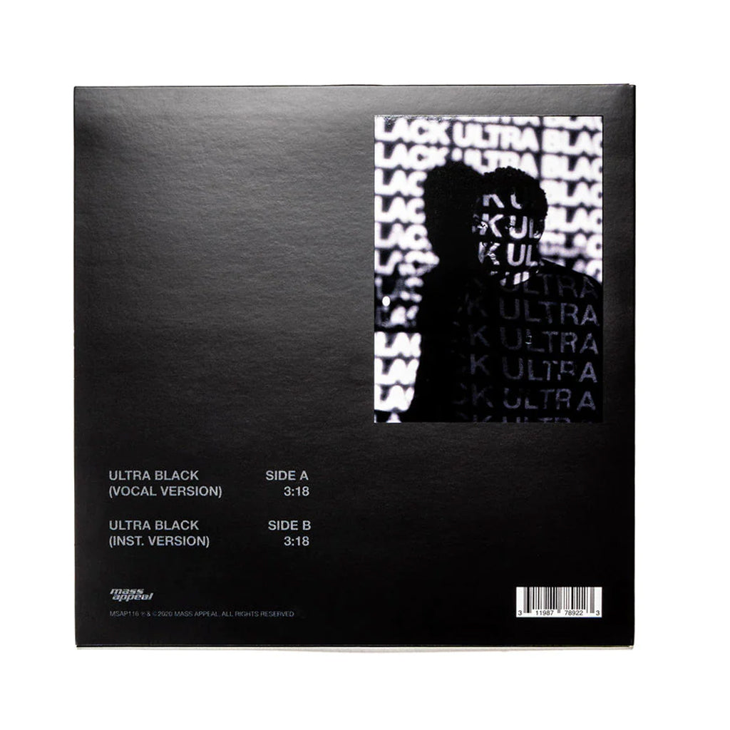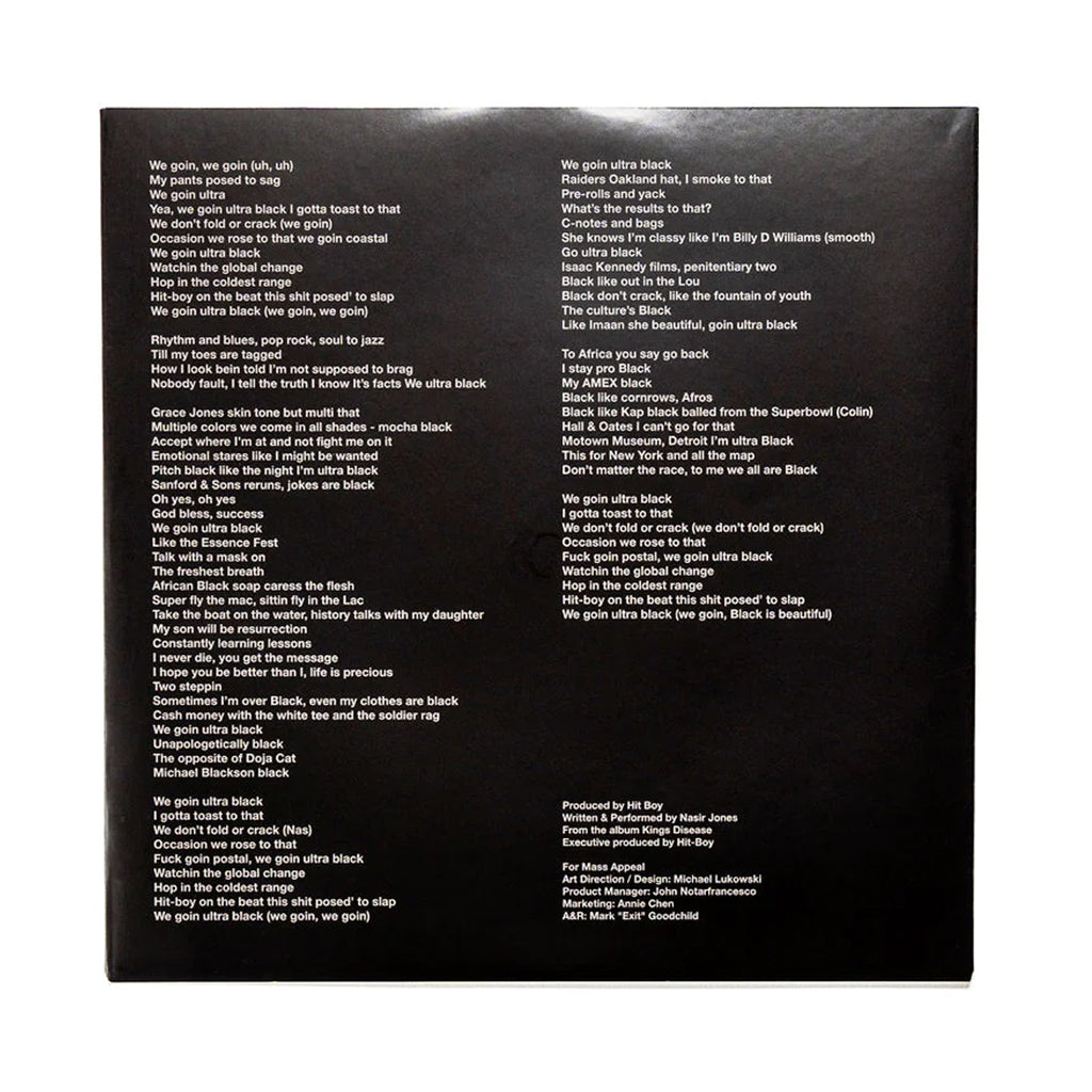 The classic Nas "Ultra Black" from King's Disease, on black ice (semi transparent) colour vinyl 7" single, in a matte finish jacket w/ spot gloss hits, and a printed inner sleeve featuring the song lyrics.