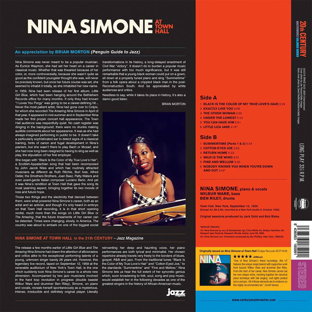 York's Town Hall, issued that same year as Nina Simone at Town Hall. It includes such classics as 'Black Is the Colour of My True Love's Hair', 'The Other Woman', and an