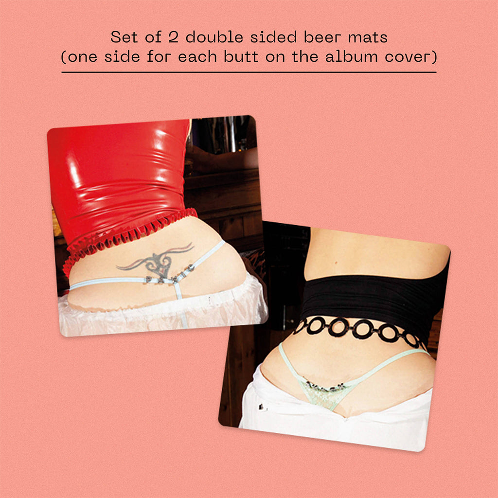 • Set of 2 double-sided beer mats (one side for each butt on the album cover) *