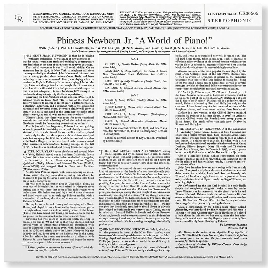 Acoustic Sounds and Contemporary Records present this reissue of Phineas Newborn Jr.'s 1962 Contemporary Record debut 'A World of Piano!'. Recorded by legendary engineers Howard Holzer and Roy DuNann the album also features Paul Chambers (bass), Philly Joe Jones (drums), Sam Jones (bass) and Louis Hayes (drums).
