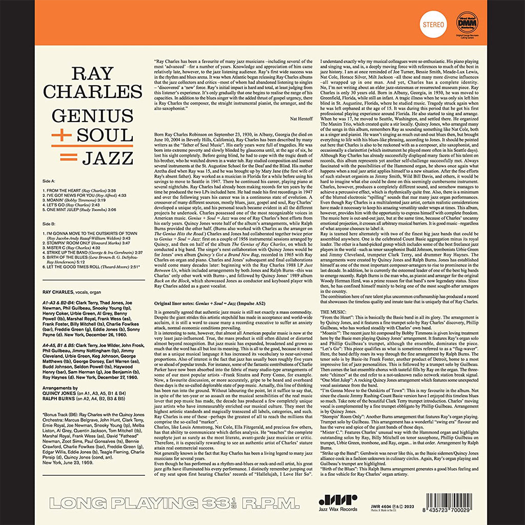 RAY CHARLES - Genius + Soul = Jazz (Jazz Wax Reissue w/ Bonus Track) - LP - 180g Vinyl