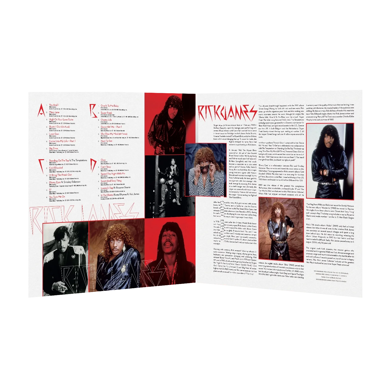 Born James Ambrose Johnson Jr. (1948-2004), Rick James transformed from draft dodger to funk legend after being signed to Motown’s Gordy Records in 1978. His debut album “Come Get It!” delivered the hits “You and I” and “Mary Jane,” but his 1981 masterpiece “Street Songs” really cemented his legacy with “Give It To Me Baby” and “Super Freak” (later sampled in MC Hammer’s Grammy-winning “U Can’t Touch This”). All these hits, including “Glow”, “Loosey’s Rap” (feat. the queen of hip hop Roxanne Shanté), “In The Ghetto” (with Busta Rhymes), “Standing On The Top” (with The Temptations) and the soulful ballad “Ebony Eyes” (feat. Smokey Robinson), can be found on this definitive Rick James compilation: ‘Collected”.