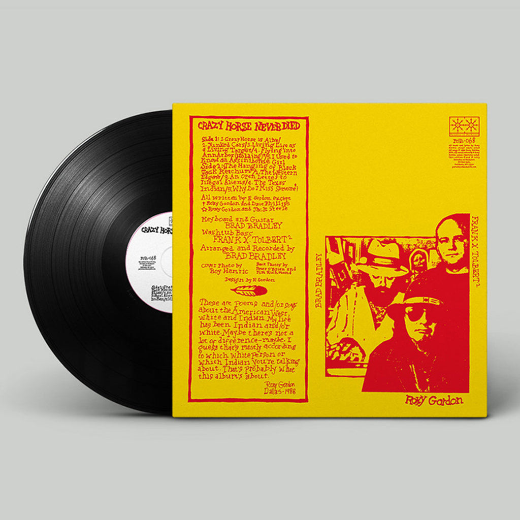 The ten songs on Crazy Horse Never Died, his first officially released and distributed album, were recorded in Dallas in 1988. “Songs” is perhaps an imprecise taxonomy for what Roxy captured on this and his other albums, all of which remain out of print or were released in instantly obscure limited editions of homebrew cassettes and CD-R’s. (Paradise of Bachelors plans to reissue remastered, expanded editions of his catalog; Crazy Horse is the first.) He only occasionally attempted to sing, and his musical recordings are primarily corollaries of, and vehicles for, his poems. His sharp West Texan drawl, tinged by formative years of reservation living in Montana and unmistakable once you hear it high, lonesome, flat, and cold-blooded as a bare rusty blade instead patiently unfurls in skewed sheets of anecdotal verse and discursive narrative rants. His songs are essentially recitations over backing tracks of fingerpicked guitars, rubbery washtub bass, and buzzing, oscillating keyboards. On the stark yellow and red jacket of Crazy Horse, which he designed himself, Gordon describes these recordings as innately ambivalent in terms of form, content, and identity: These are poems and/or songs about the American West, white and Indian.