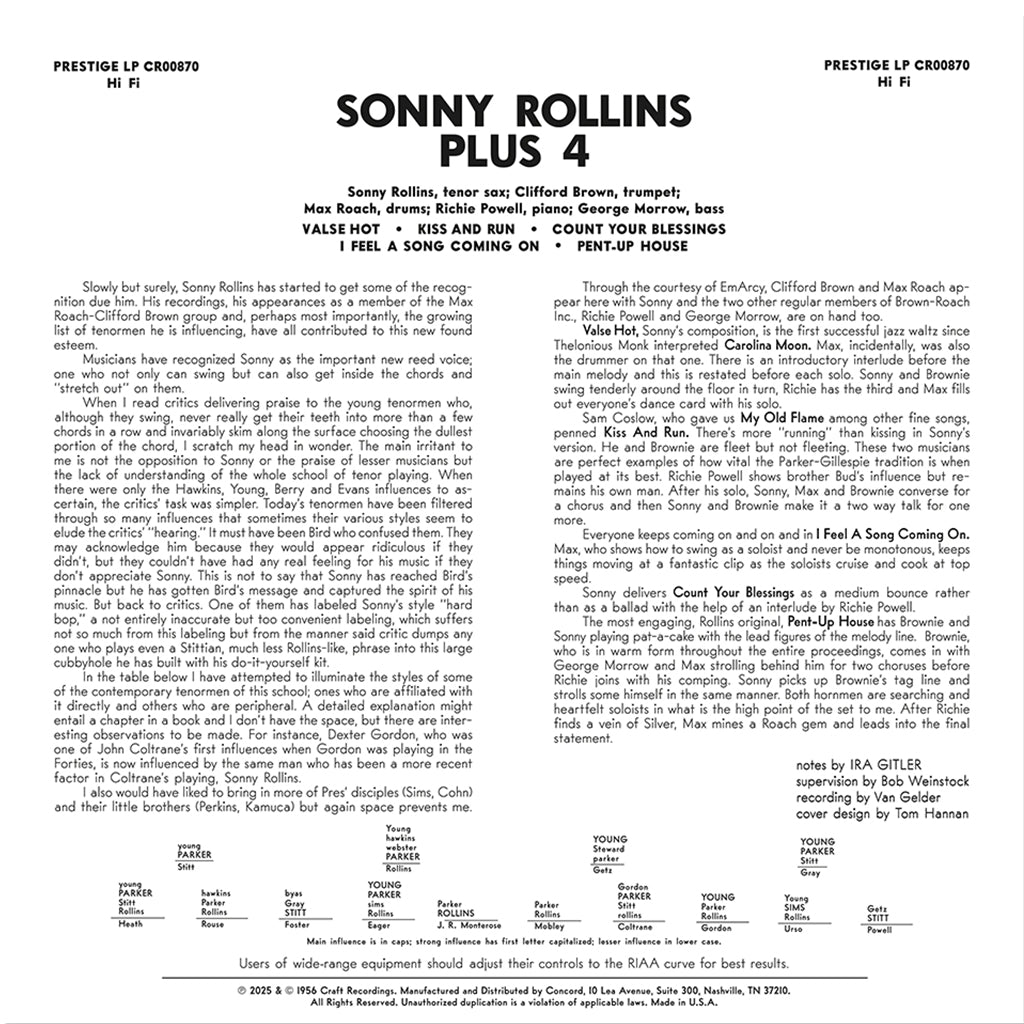 Plus 4 was originally released on Prestige in 1956 and features Sonny Rollins playing with the Cliff Brown/Max Roach Quintet. Described as a particularly strong hard bop set, the album contains 5 cuts, including 2 Rollins originals “Pent-Up House” and one of his best known pieces, “Valse Hot”.