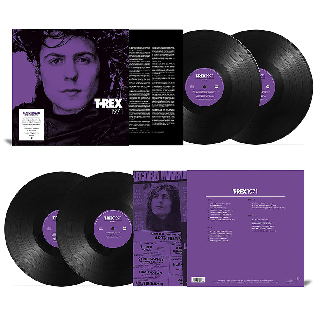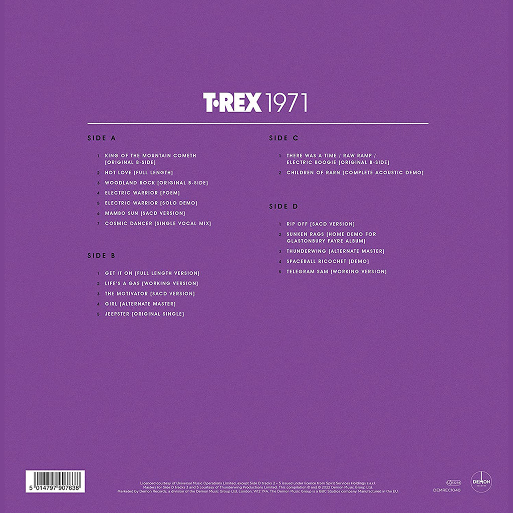 Following the success of the 2LP set 1972, Demon Records is proud to announce two new releases in the Marc Bolan “Songwriter” series. This is a vinyl-only, intimate series that focuses on the private and creative Marc Bolan, with the emphasis on how that affected his songwriting. The second of these new releases is another 2LP set, 1971, which takes us to the year in which T. Rex became a chart-topping phenomenon. This 19 track selection includes full-length versions of the hits “Hot Love” and “Get It On”, along with the single version of “Jeepster”. But also included are many other recordings from 1971: B-sides, working versions of “Telegram Sam” and “Life’s A Gas”, and demos like the 15-minute Complete Acoustic Demo of “Children Of Rarn”. This release has been compiled and fully annotated by Mark Paytress, author of the definitive biography “Marc Bolan: The Rise And Fall of a 20th Century Superstar”, and the recently-published “Glam! When Superstars Rocked The World, 1970-74”.
