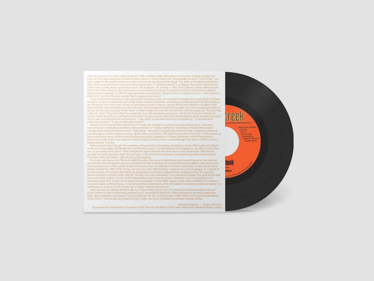 The deluxe gatefold 7" vinyl edition, limited to 500 copies, features recently rediscovered and restored early (and superior) mixes of both songs; a printed inner sleeve with the original liner notes by Allen and an excerpt from the book; a lyrics insert; and Allen’s contemporaneous visual art in an arresting package.