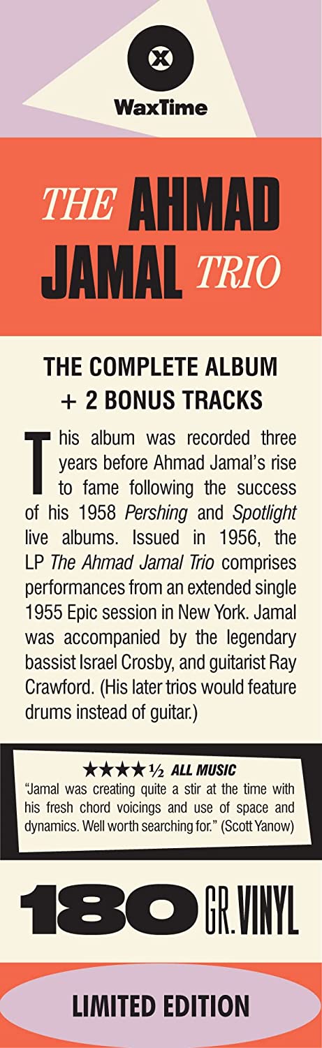 This album was recorded three years before Ahmad Jamal's rise to fame following the success of his 1958 Pershing and Spotlight live albums. Issued in 1956, the LP The Ahmad Jamal Trio comprises performances from an extended single 1955 Epic session in New York. With Jamal accompanied by the legendary bassist Israel Crosby, and guitarist Ray Crawford.