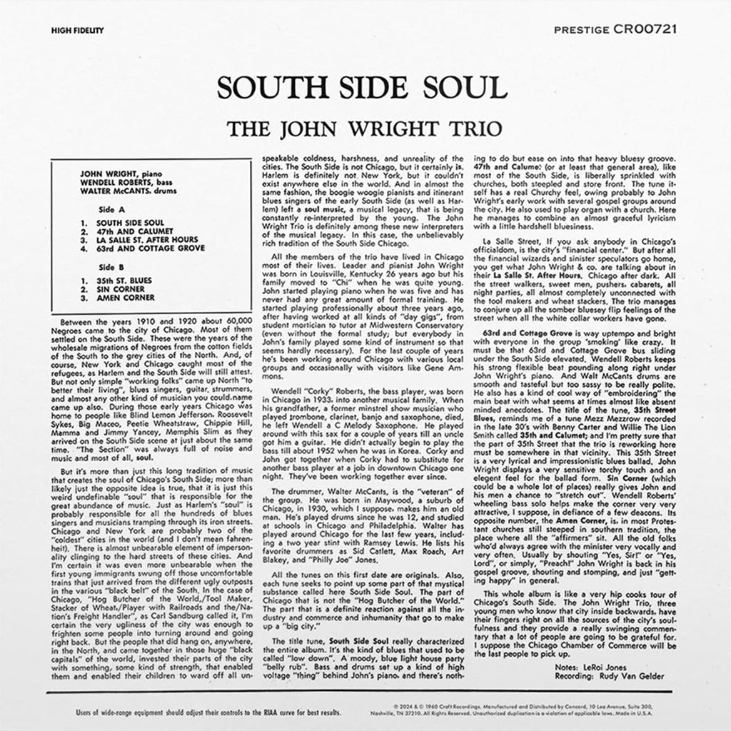 THE JOHN WRIGHT TRIO - South Side Soul (Original Jazz Classics Series) - LP - Deluxe 180g Vinyl