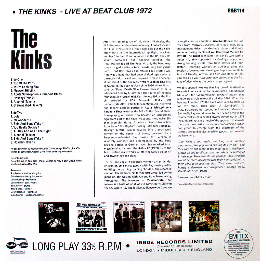 After their amazing run of mid-sixties hit singles the Kinks became becalmed commercially, if not artistically. The June 1970 release of the single Lola put the Kinks firmly back in the international spotlight, reaching number 2 in the UK and number 9 in the US. The Lola album contained our opening number, the tribute/satire Top Of The Pops. Visually the band may have changed – satin jackets, beards, long hair, garish flares) – but Ray Davies had retained his acerbic wit. Here was a band that had been shafted repeatedly by the music industry and was prepared to make a concept album about it. The fine rocker You’re Looking Fine first appeared on the Face To Face LP in 1966 where it was sung by “Dave (Death Of A Clown) Davies”, as he is introduced here by his brother. The source of the next four songs is Muswell Hillbillies (August 1971), the first LP recorded for RCA. Muswell Hillbilly itself demonstrates Ray’s affinity for country music in general and Johnny Cash in particular. Acute Schizophrenia Paranoia Blues features the Mike Cotton Sound, three brass-playing musicians who became an increasingly significant part of the Kinks live sound, more Acker Bilk than Memphis Horns. A delicate piano introduction from John “The Baptist” Gosling introduces Holiday. Onstage Alcohol would develop into a protracted sermon on the dangers of booze, delivered by a frequently-inebriated Ray Davies: this version is relatively compact and accompanied by the band necking bottles of German lager. Brainwashed is an engaging diatribe from the Arthur LP (1969). Here the brass section really works, reinforcing Dave’s guitar riff and driving the song along.
